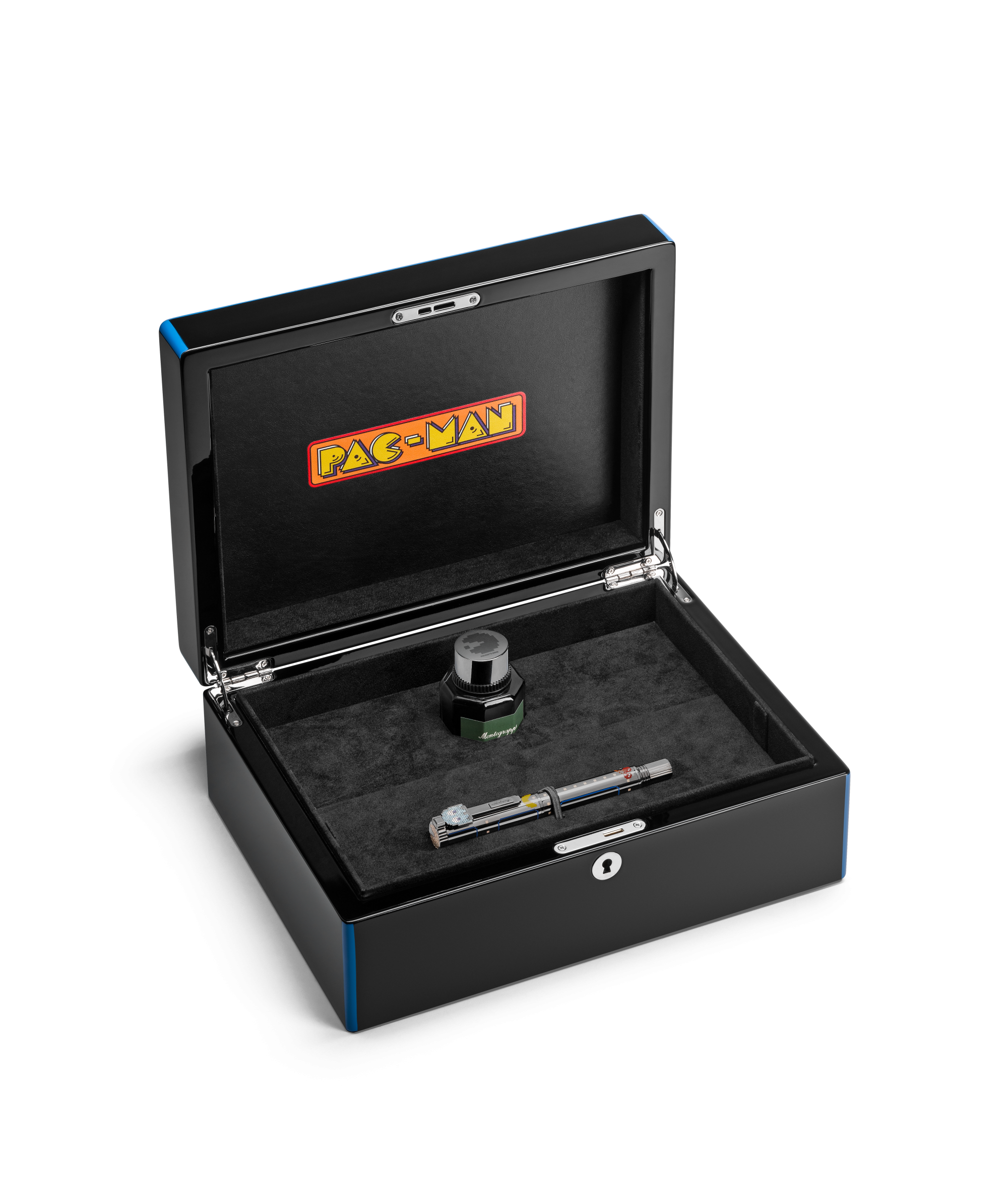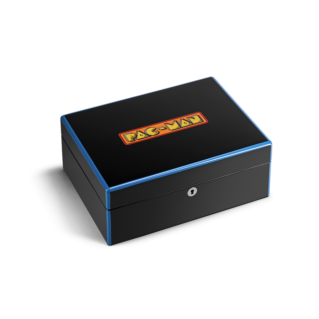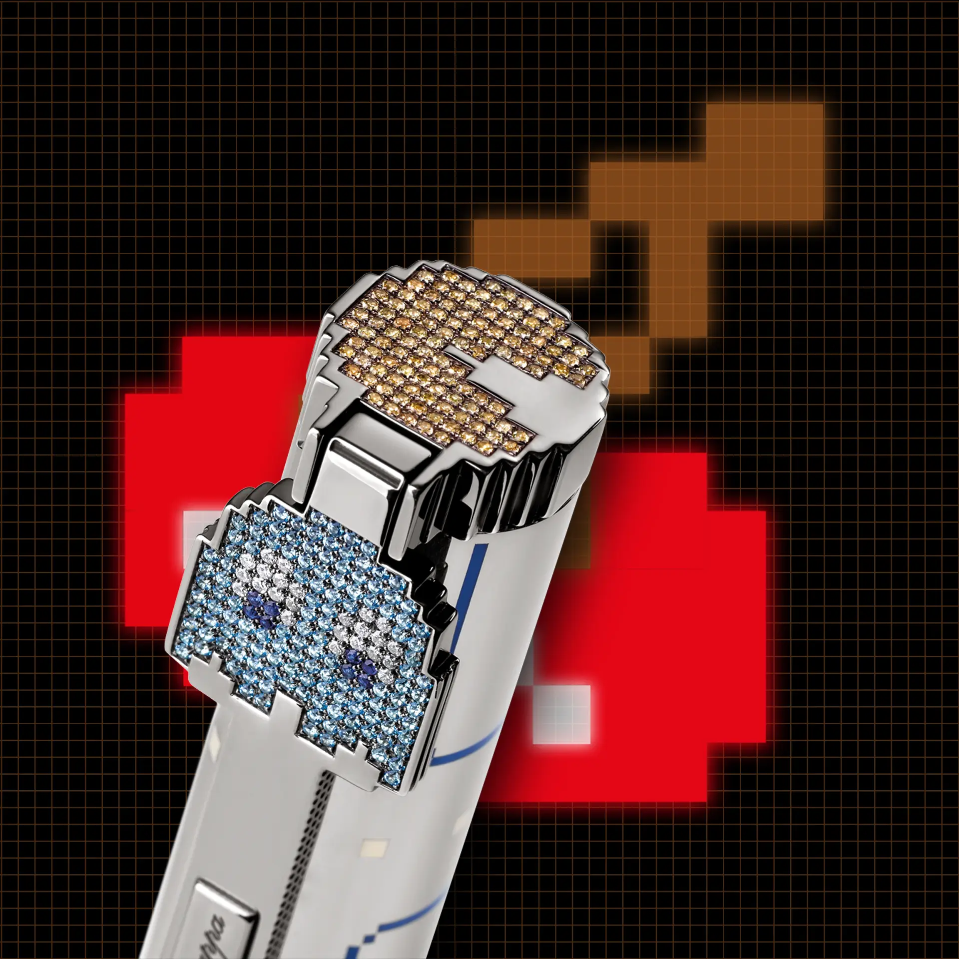 Auf der Abschlusskappe erscheint PAC-MAN mit pixelgenauer Treue, umgesetzt in einer Komposition aus handgefassten gelben Saphiren.