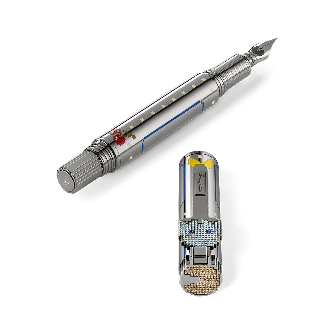 Die pixelstrukturierte Griffzone und die 18-karätige Goldfeder übersetzen die Spannung des Spiels in eine Geste von Meisterschaft und Kontrolle.