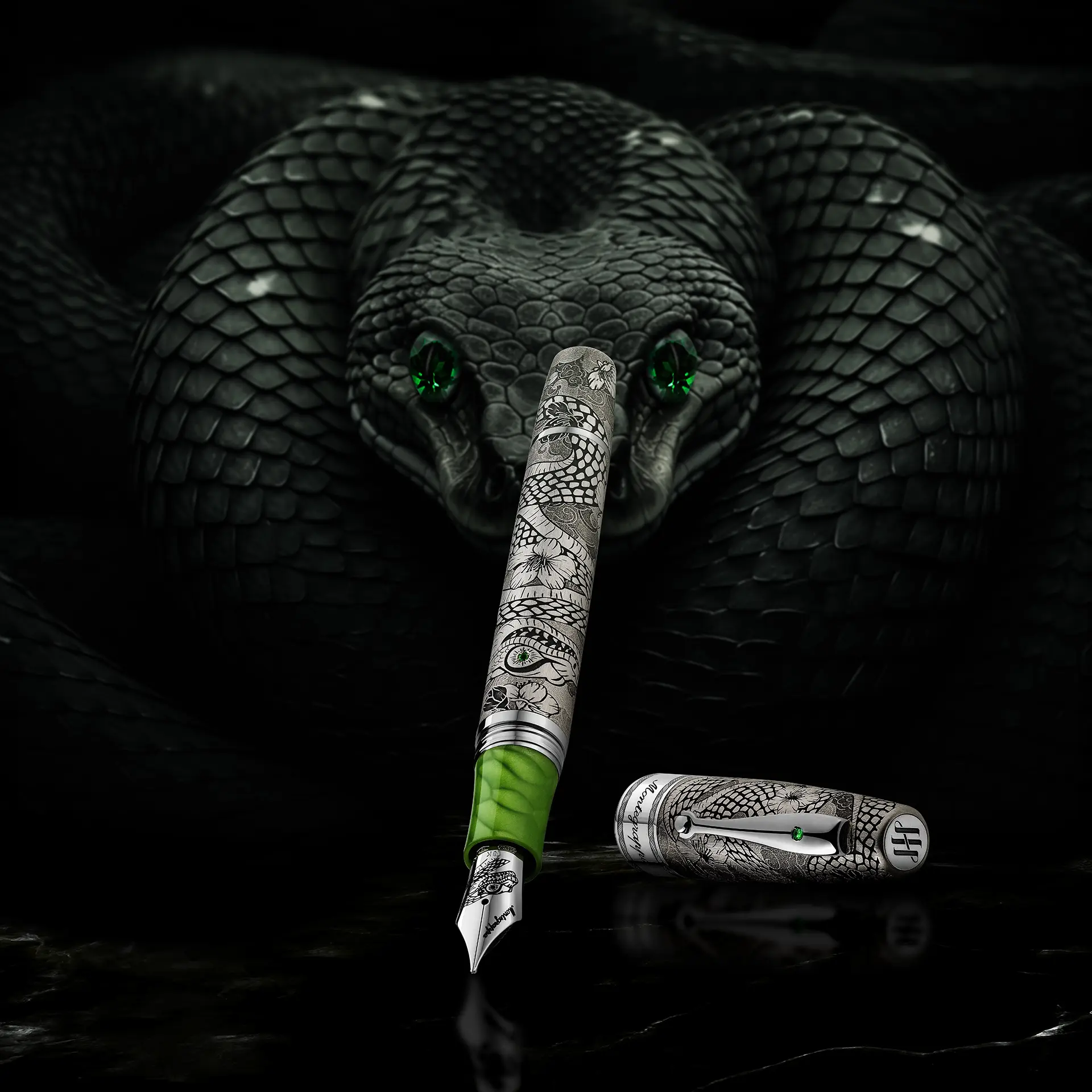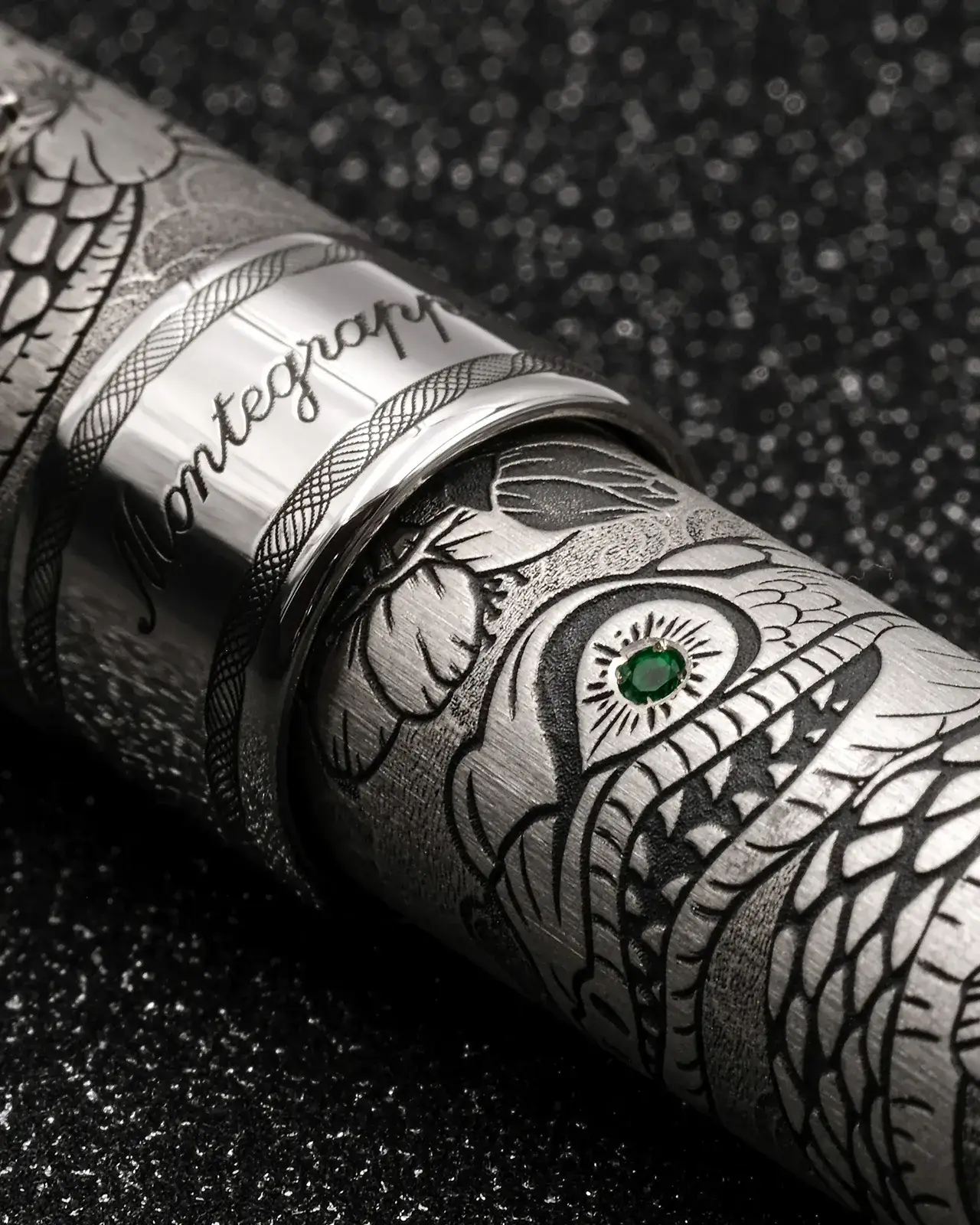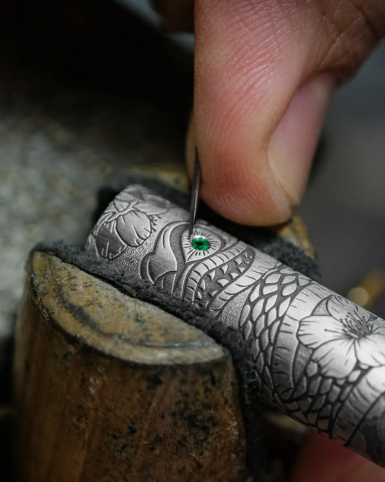 Das Bedürfnis von Schlangen, sich zu häuten, ist eine Metapher für persönliches Wachstum. Neue Anfänge erwarten dich zwischen den Smaragden und der schuppigen Textur des Juma® „Green Mamba“-Harzes. Eine umfassende und gewagte Infinity-Gravur definiert jede sich windende Linie mit unterschiedlicher Dichte, die die Komplexität ihrer Struktur offenbart. Intelligenz und Geheimnis und ein Hauch von Gefahr verbinden sich mit Instinkt zu überleben.