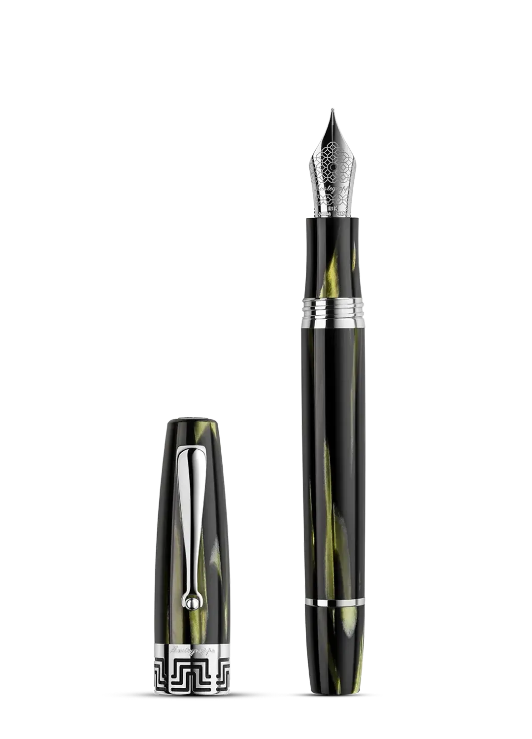In den Clip eingelassen, symbolisiert ein einsamer Diamant das kreative Lebenselixier, das die persönliche Wiedergeburt antreibt. Ein aus geädertem Montegrappite-Handwerksharz geschnitzter Griffbereich bietet das Gefühl der totalen Kontrolle.
