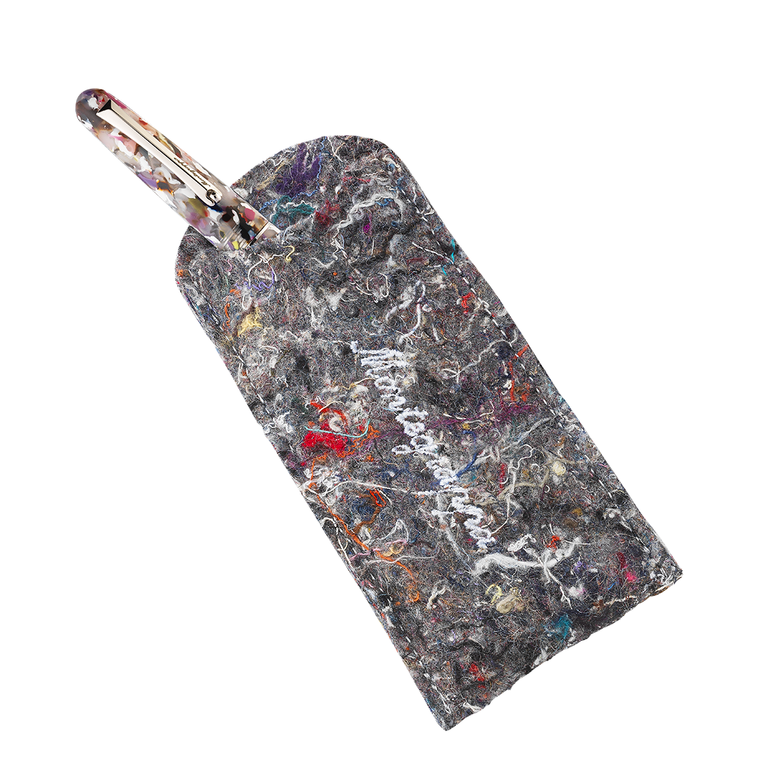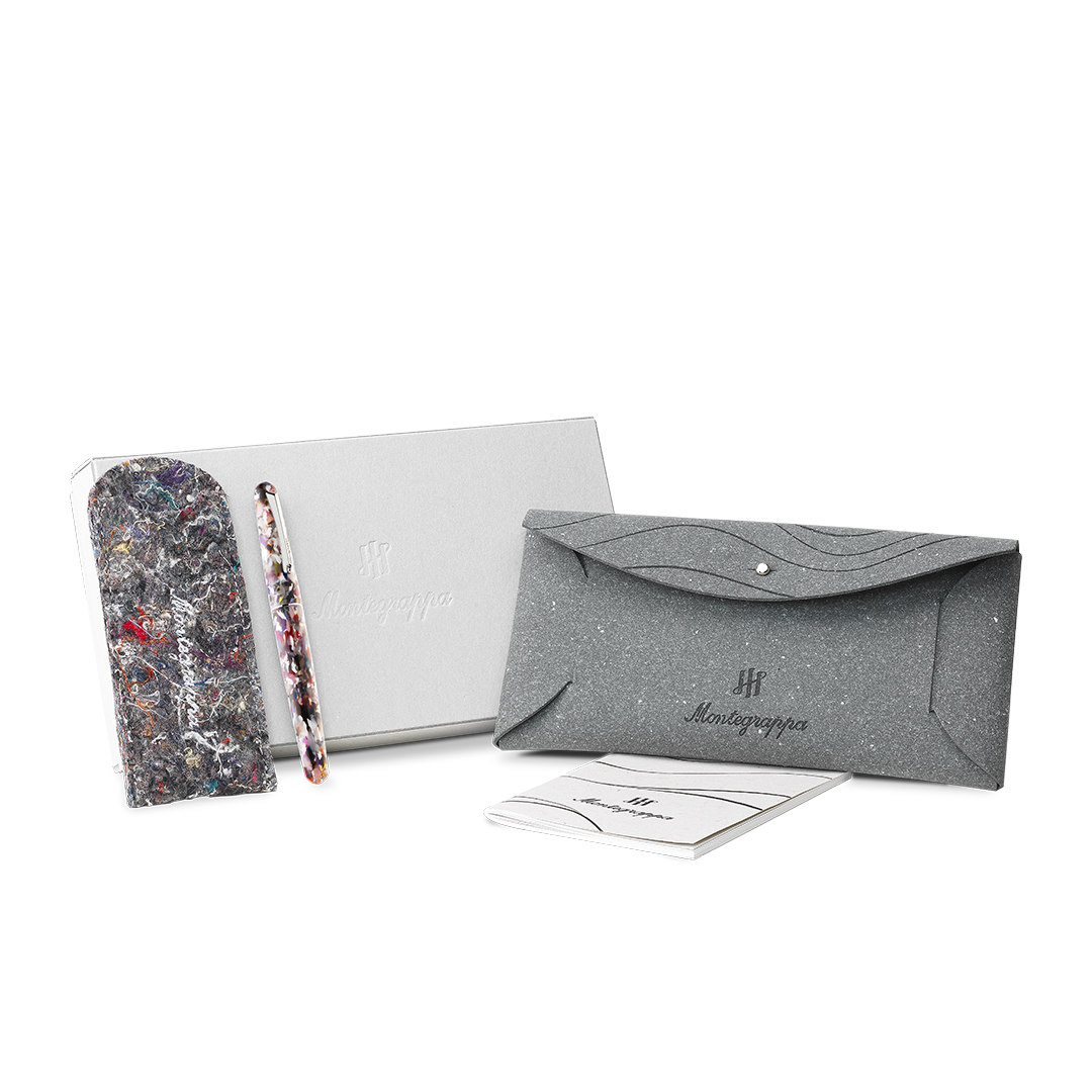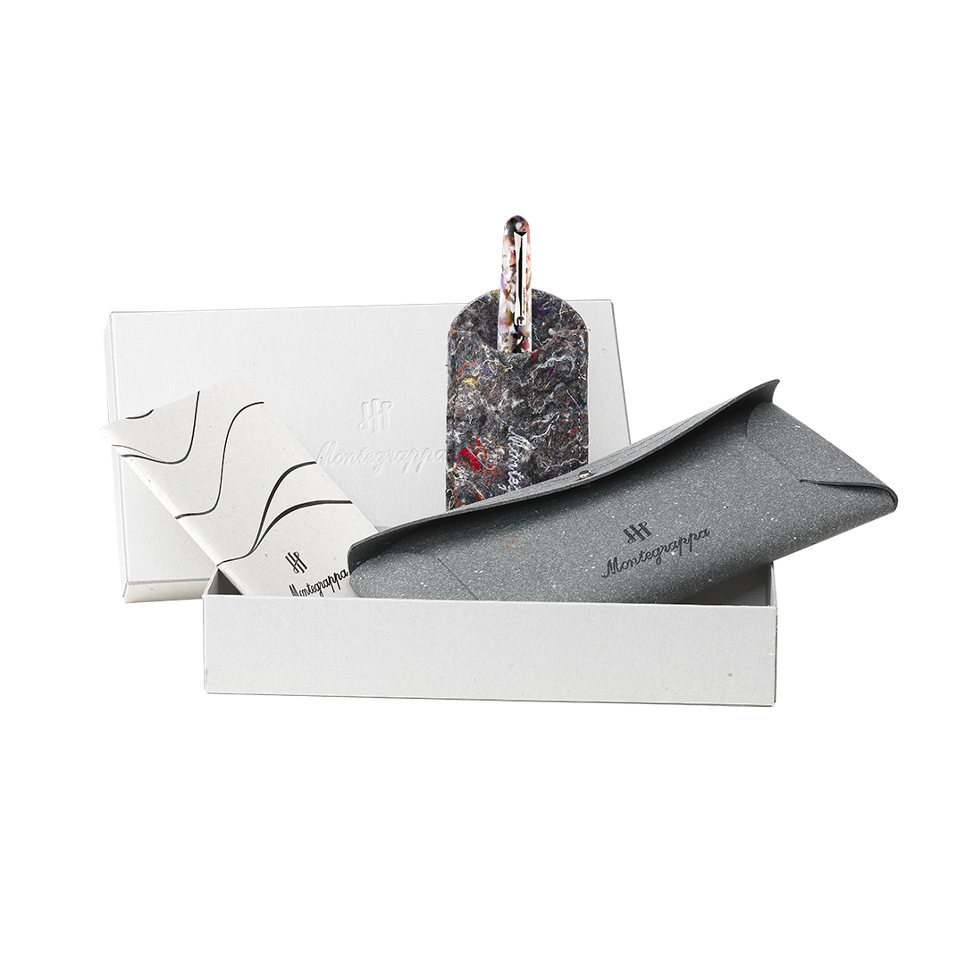 Der durchscheinende Rahmen des ersten Montegrappa, der vollständig aus recyceltem Harz besteht, verrät etwas über das frühere Leben der Materialien. Unregelmäßige Stanniolflecken, Strichcodefragmente und andere kuriose Elemente verleihen jedem Segment eine eigene Handschrift.