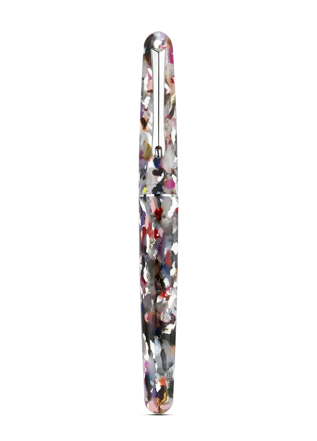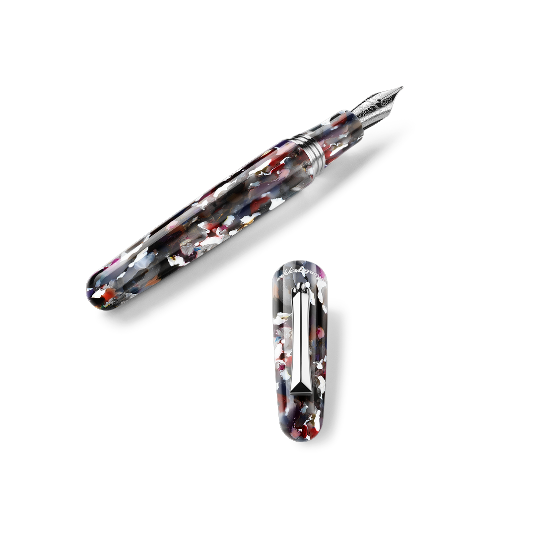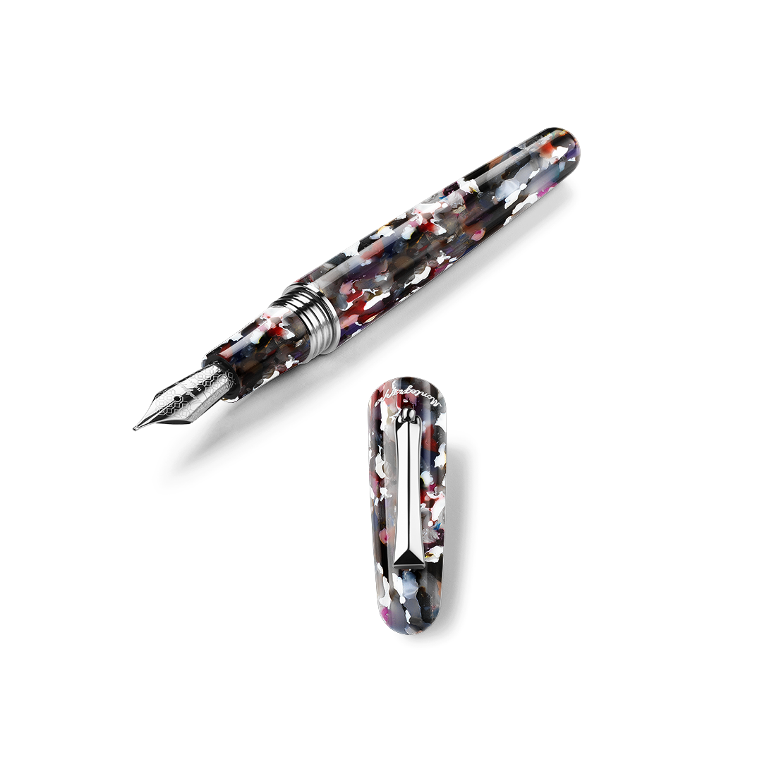 Der durchscheinende Rahmen des ersten Montegrappa, der vollständig aus recyceltem Harz besteht, verrät etwas über das frühere Leben der Materialien. Unregelmäßige Stanniolflecken, Strichcodefragmente und andere kuriose Elemente verleihen jedem Segment eine eigene Handschrift.