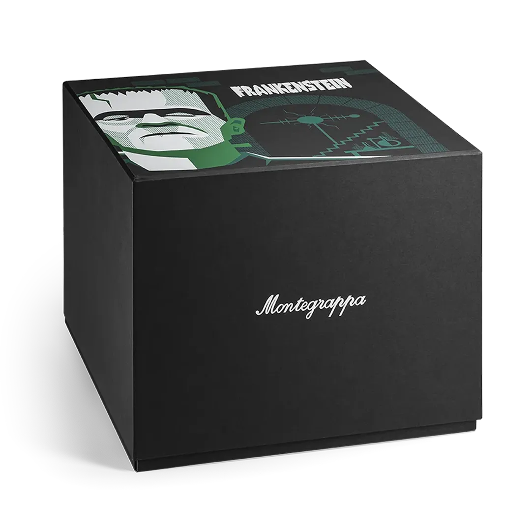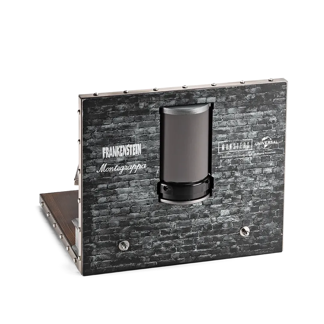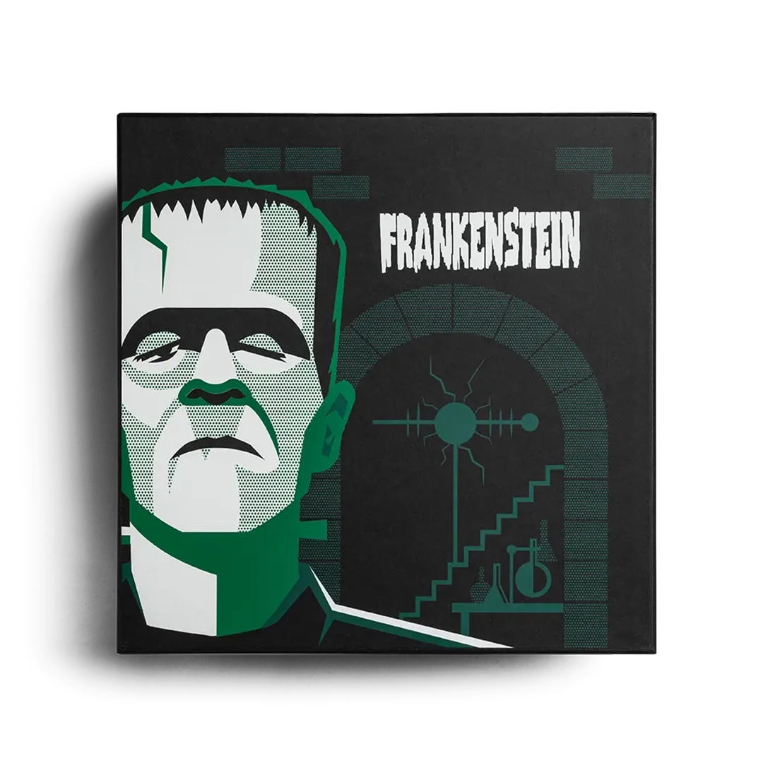 Frankensteins makabre Schöpfung verbirgt sich in einem Kuriositätenkabinett aus Messing. Mit Hilfe eines Mini-Handrads wird eine der epischsten Figuren des Kinos mit theatralischem Effekt enthüllt.