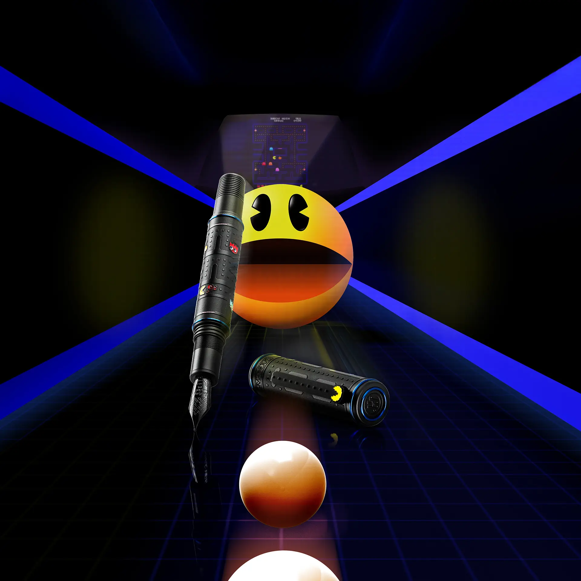 Milled out of blackened brass, the original PAC-MAN maze has a tactile, ghostly presence. Every edge is precisely machined, then sandblasted to deliver lively, reassuring handle.