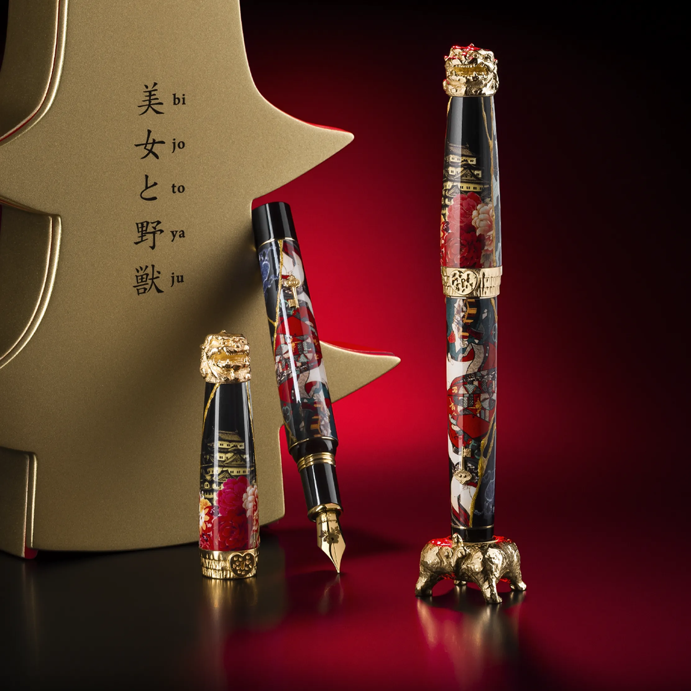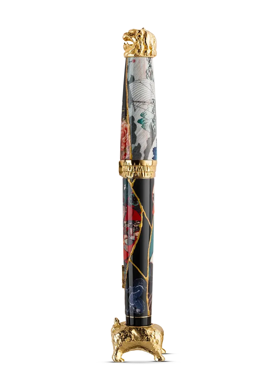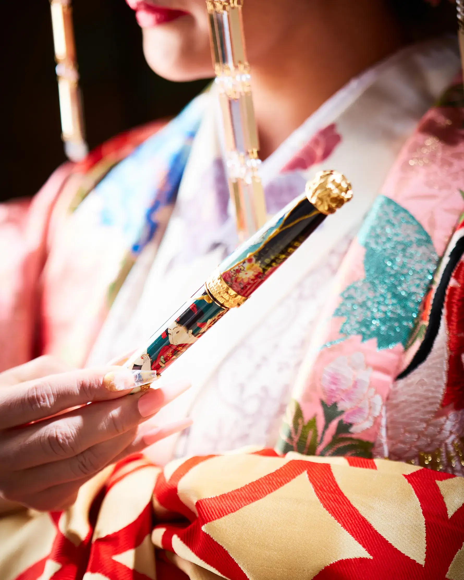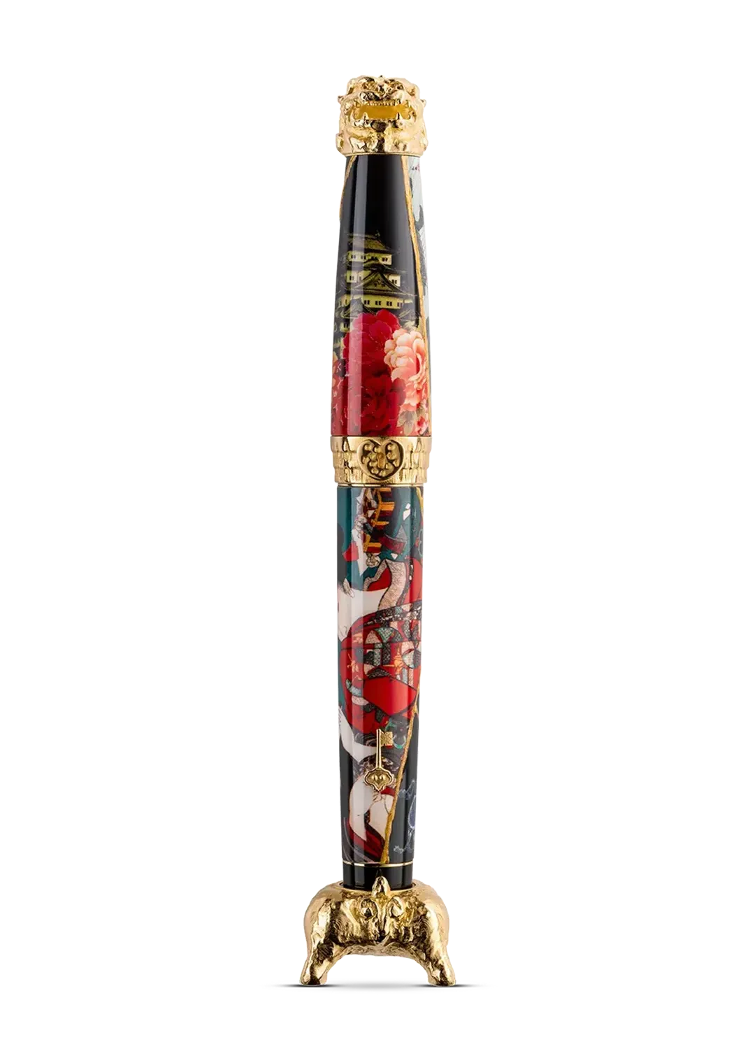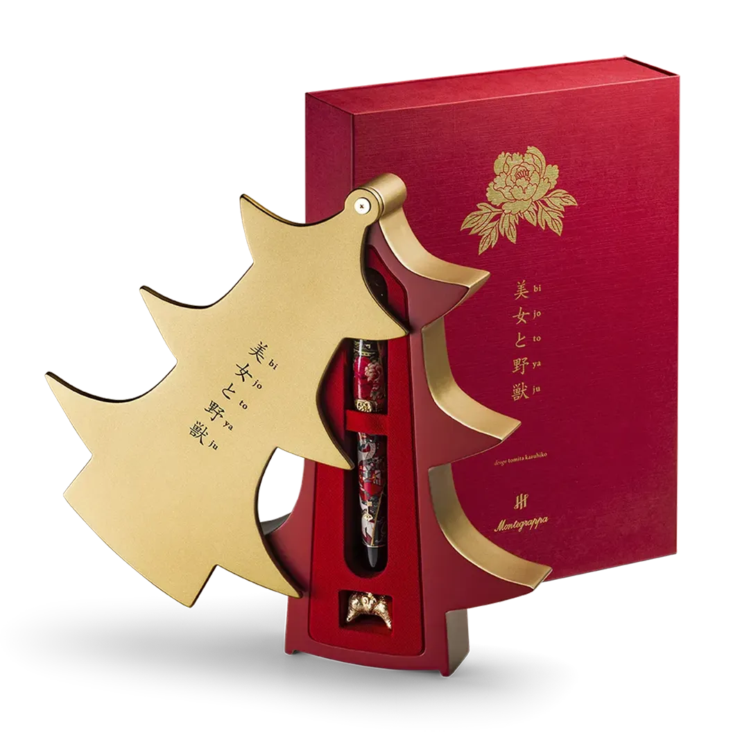 A dedicated shishi display base and a presentation case in lacquered wood accompany auspicious editions of 222 fountain pens and 99 rollerballs. Design by Tomita Kazuhiko.