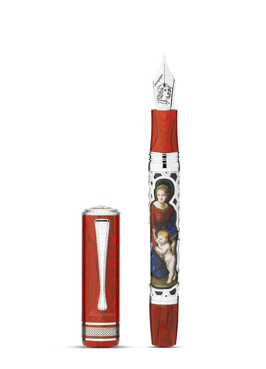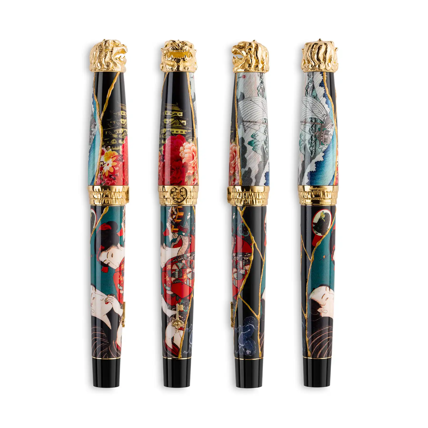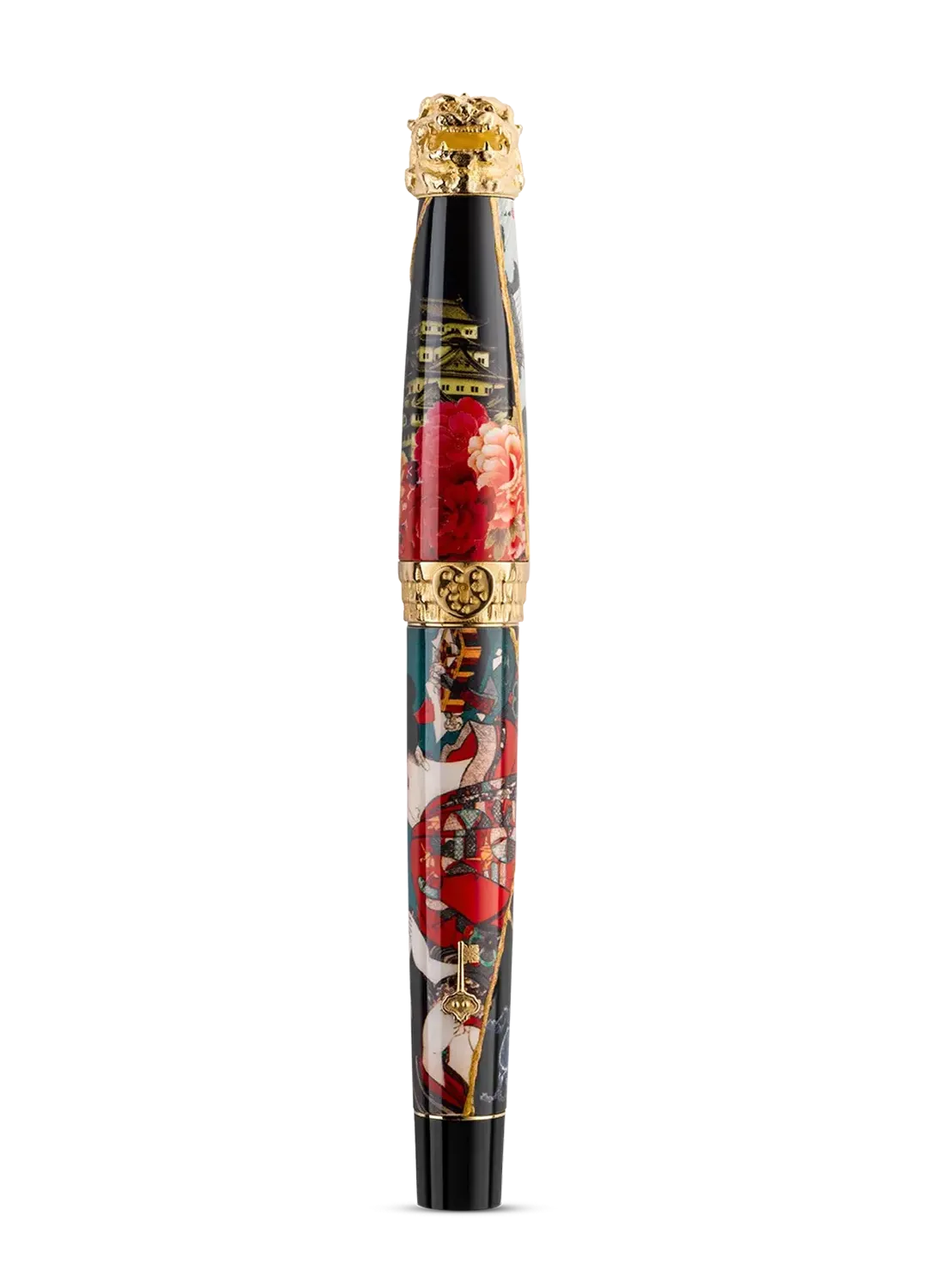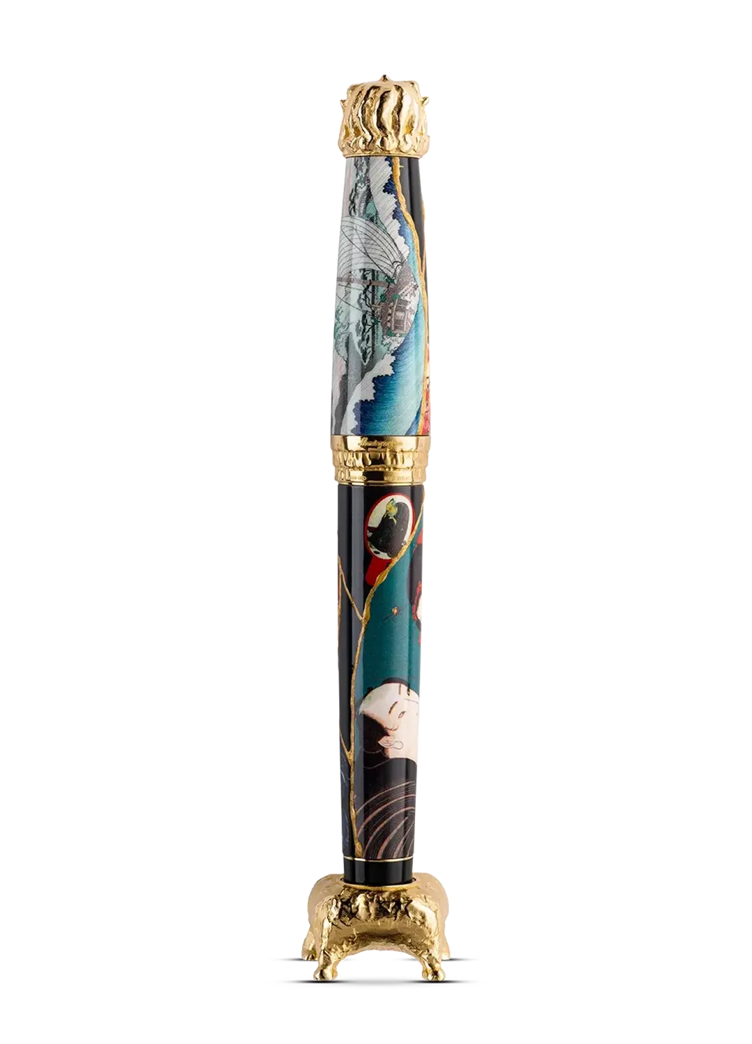 A dedicated shishi display base and a presentation case in lacquered wood accompany auspicious editions of 222 fountain pens and 99 rollerballs. Design by Tomita Kazuhiko.