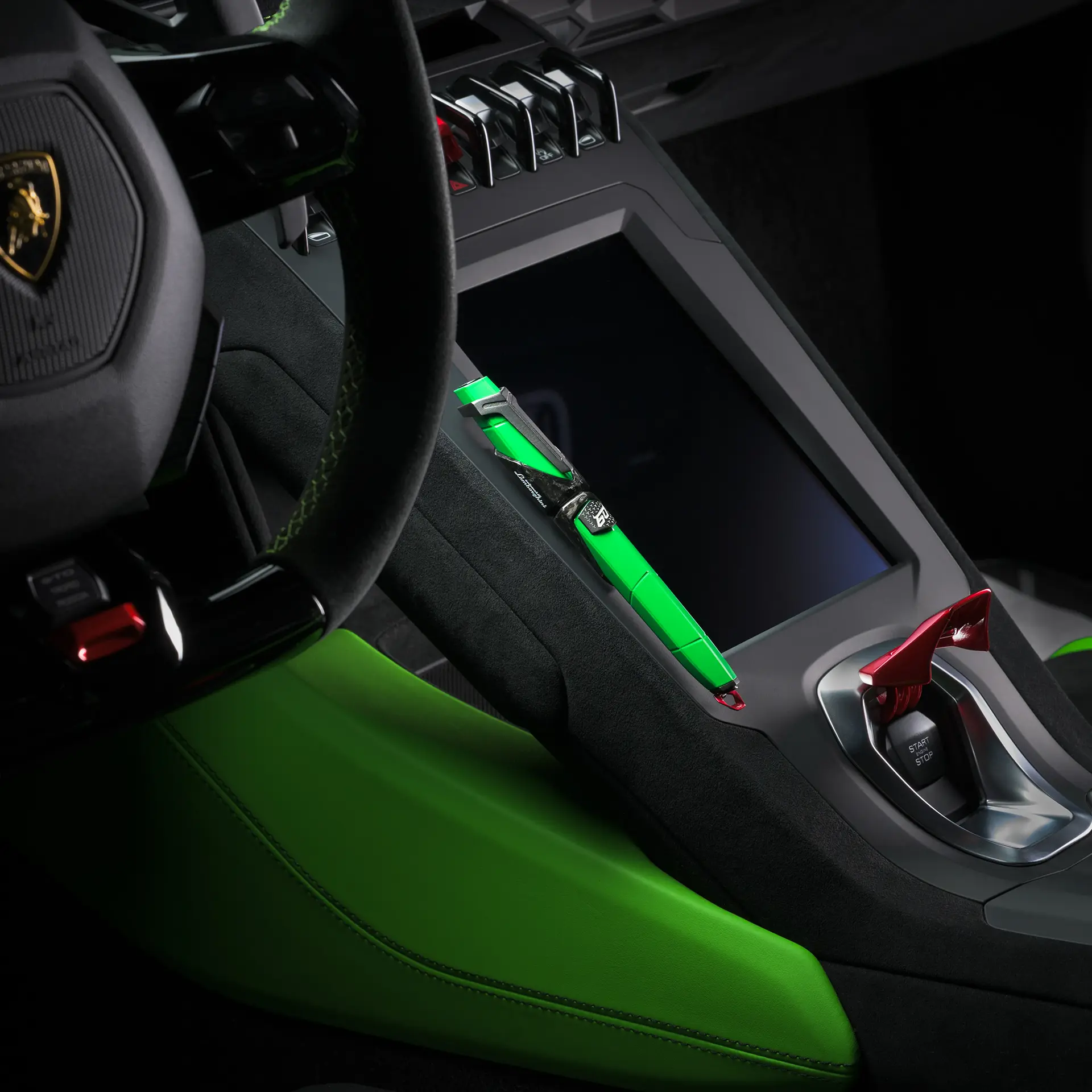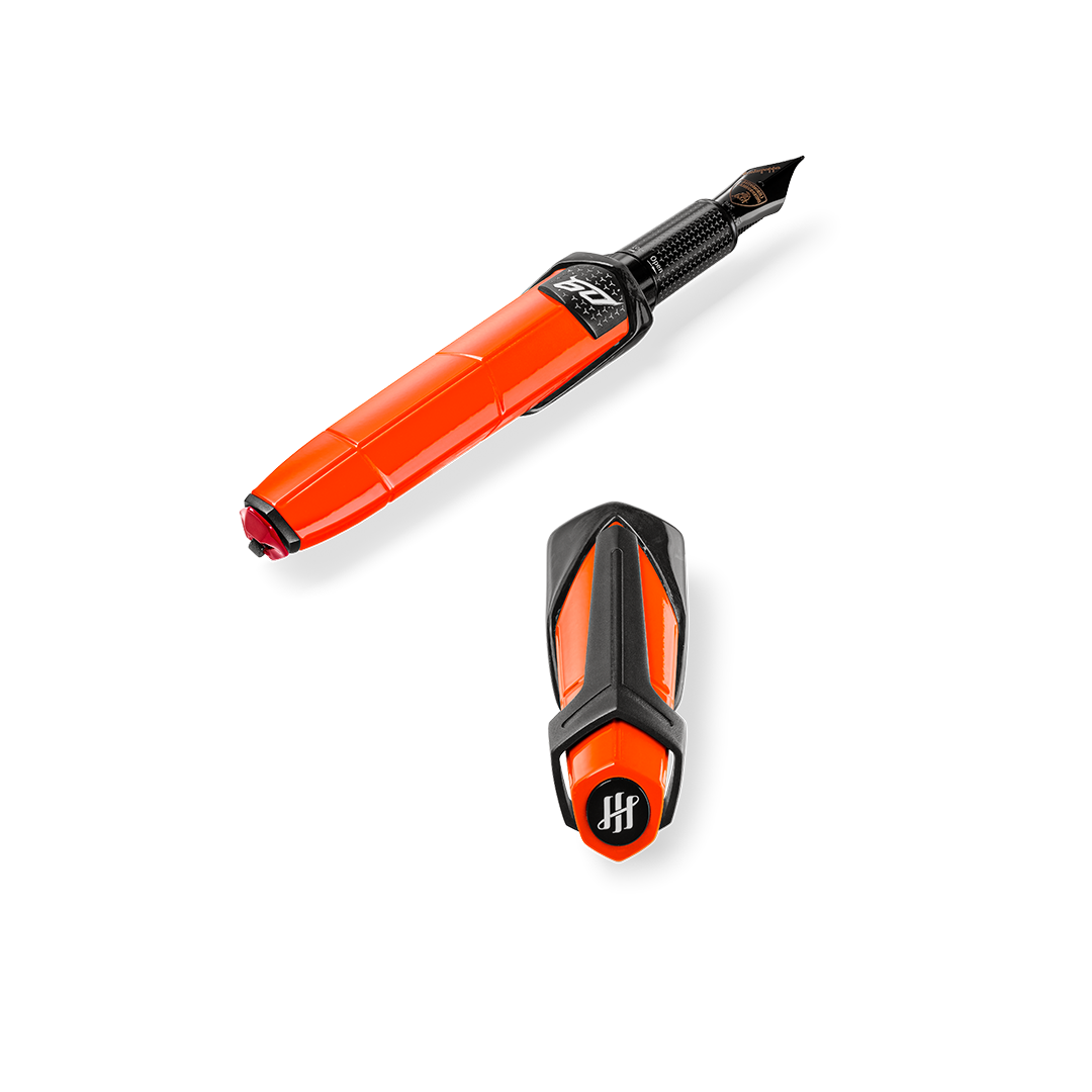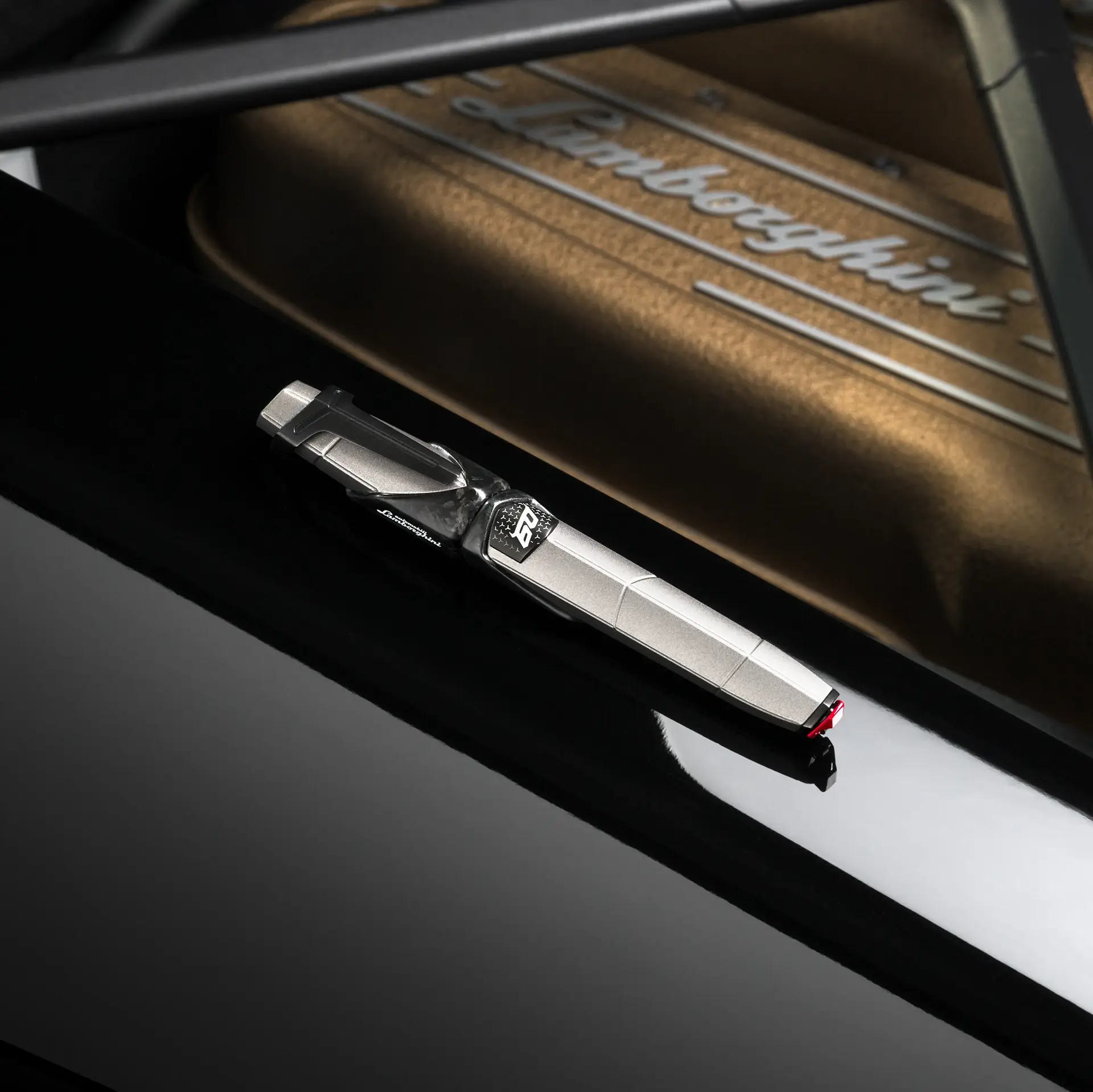 Une complication mécanique reproduisant l’emblématique gâchette rouge du bouton de démarrage des Automobili Lamborghini offre un accès rapide, en un seul geste, au réservoir des stylos-plume et rollers.