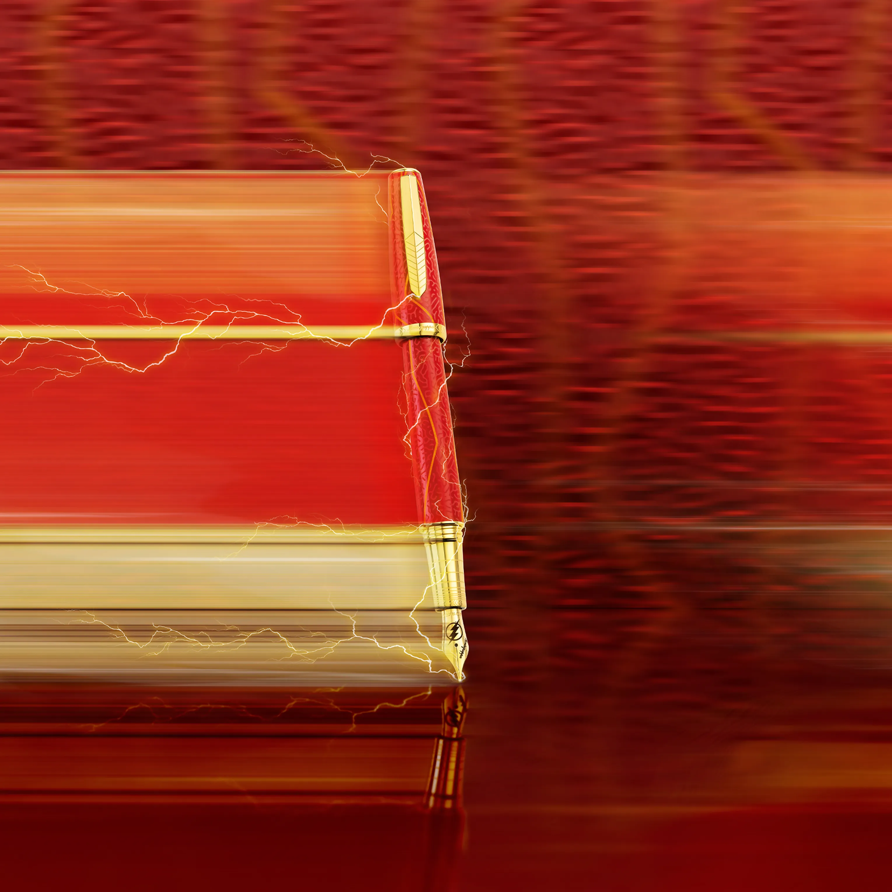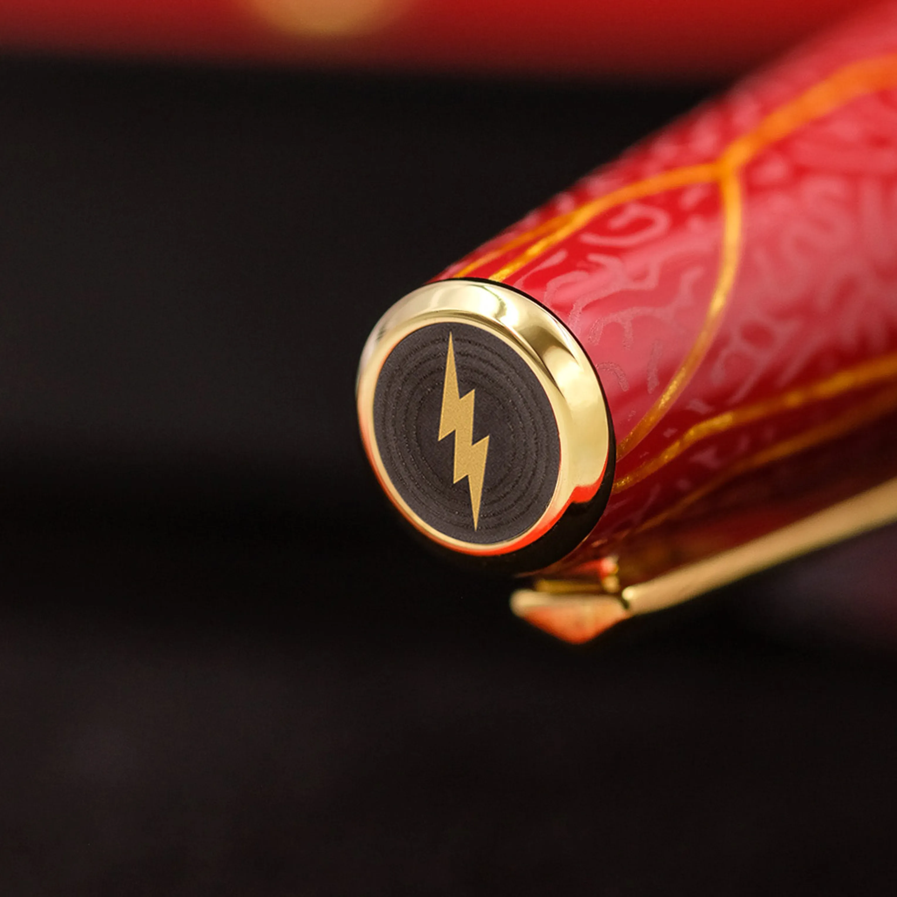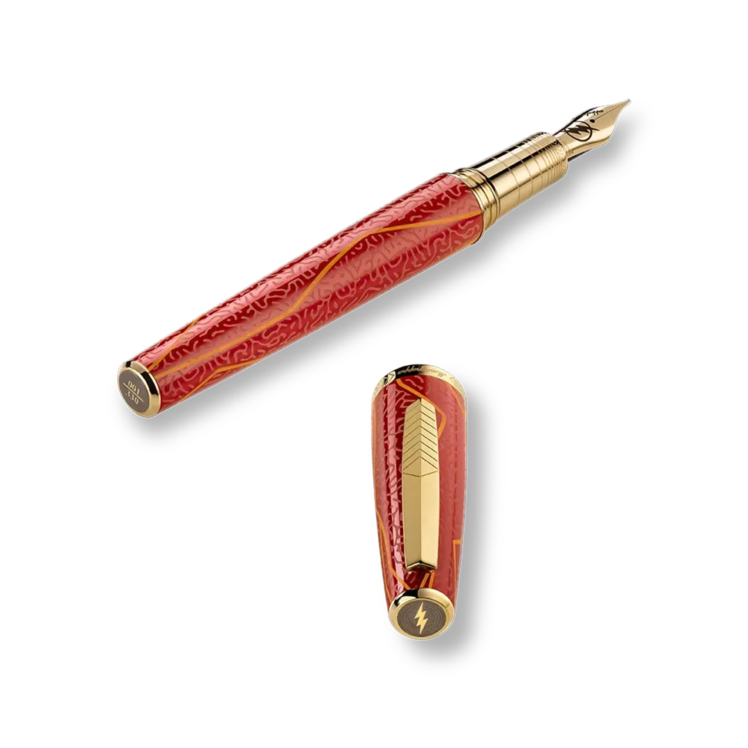 La résine carmin et la gravure en motif de Turing évoquent le costume ignifugé de The Flash sur des formes effilées et un profil sans couture. Les gravures au laser, réalisées en profondeur sur tout le corps du stylo, sont retravaillées à la main en appliquant de fines lignes d'émail doré.