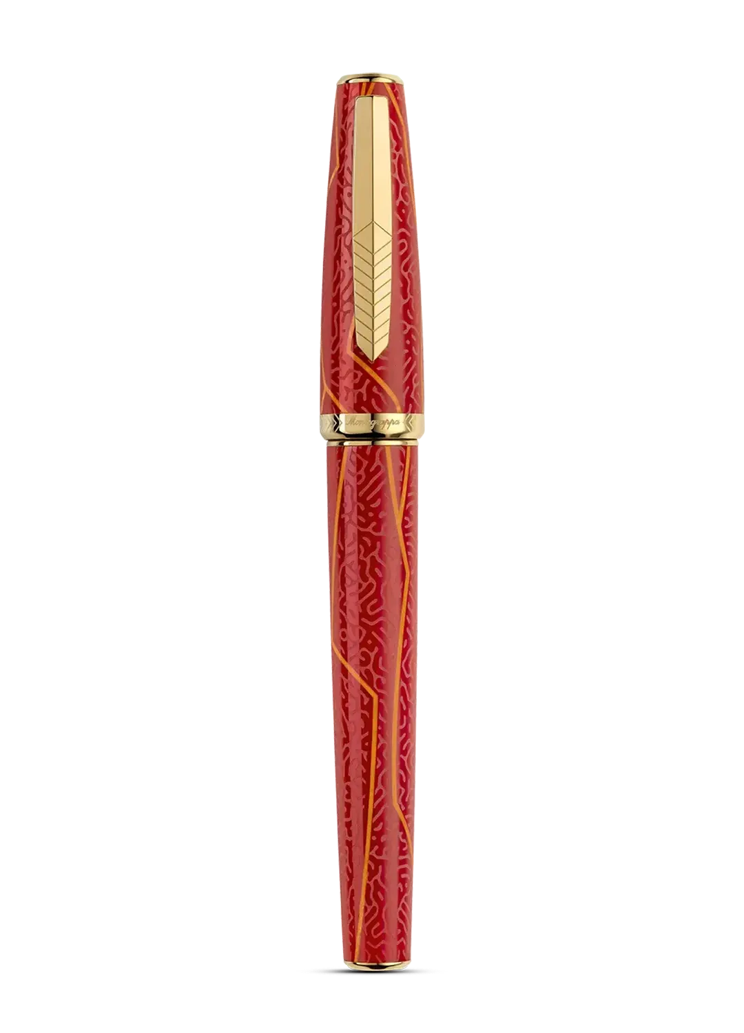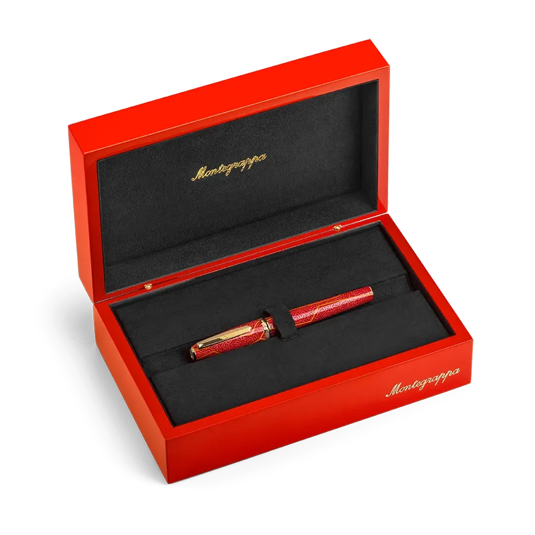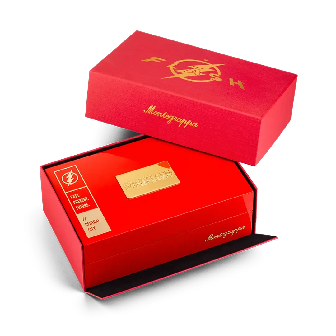 La résine carmin et la gravure en motif de Turing évoquent le costume ignifugé de The Flash sur des formes effilées et un profil sans couture. Les gravures au laser, réalisées en profondeur sur tout le corps du stylo, sont retravaillées à la main en appliquant de fines lignes d'émail doré.