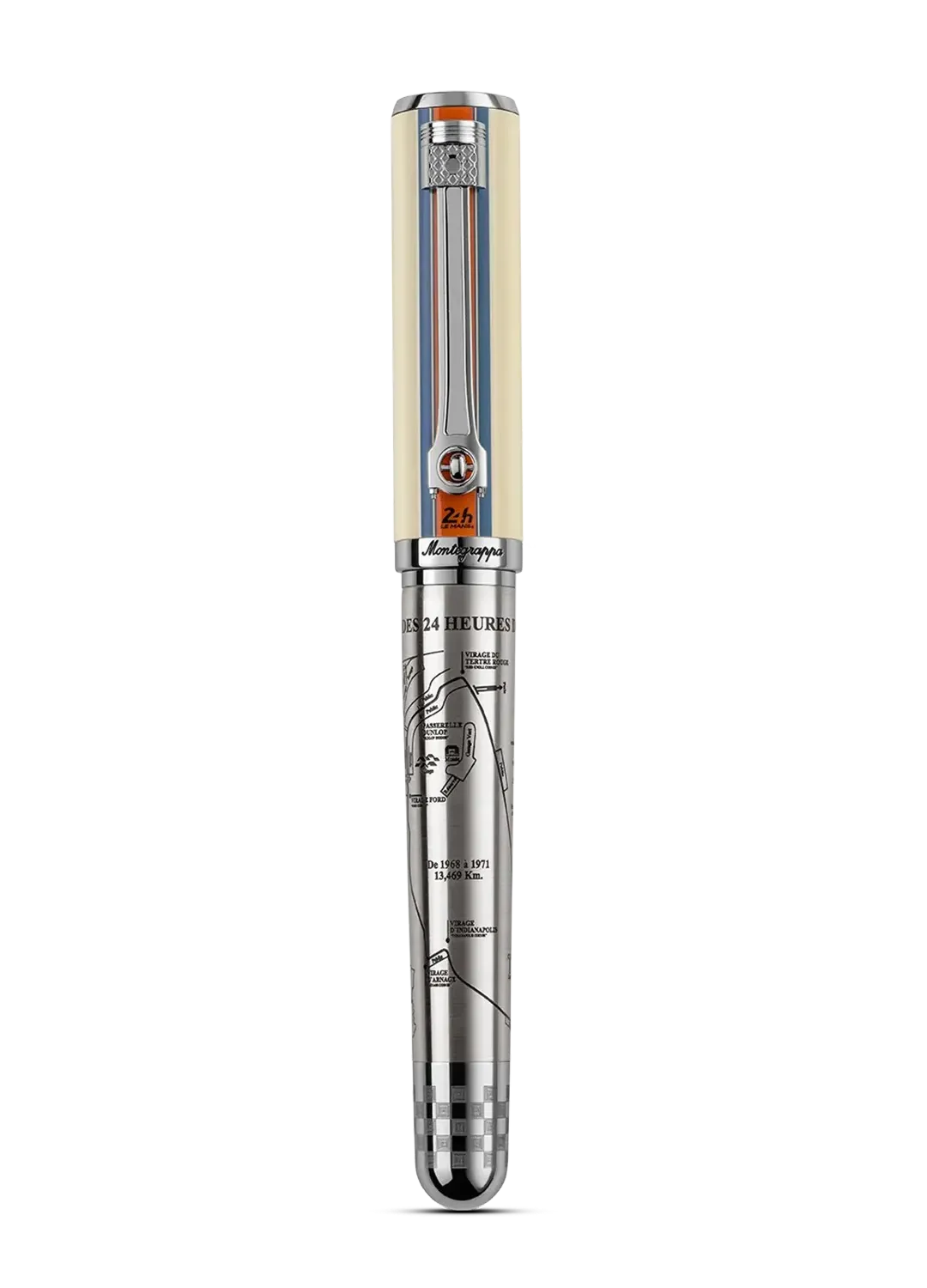 Sur le corps en acier figure le légendaire circuit des 24 heures tel qu’il était en 1971, avec la ligne droite des Hunaudières, à l’époque longue de 6 km, sur laquelle des vitesses de pointes à plus de 400 km heure ont été enregistrées.