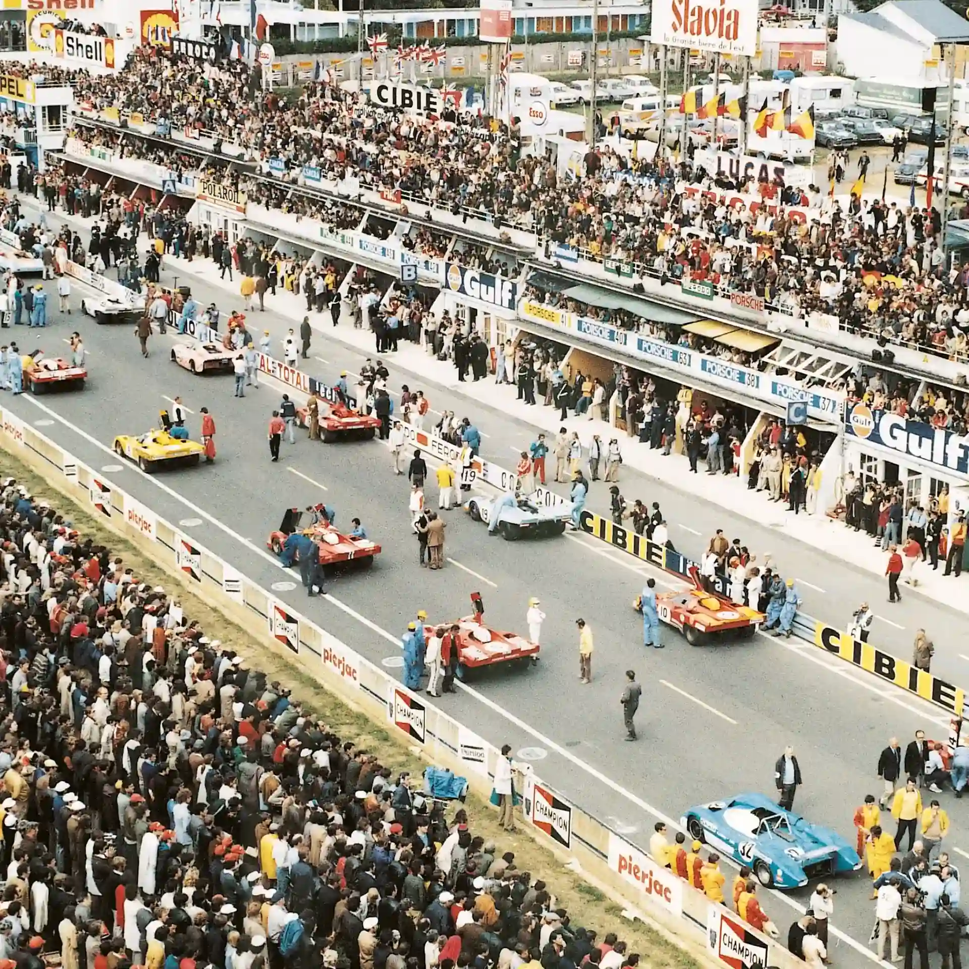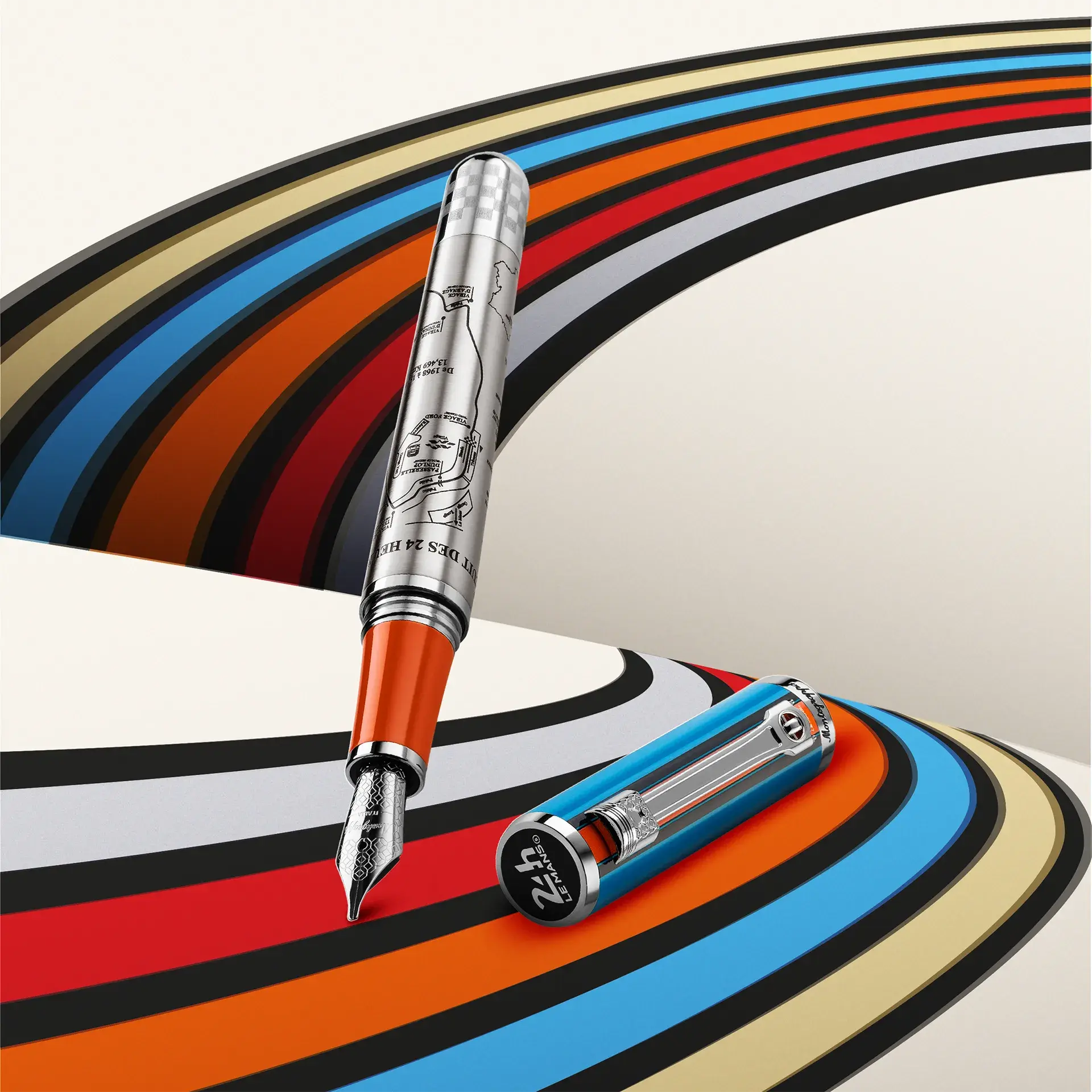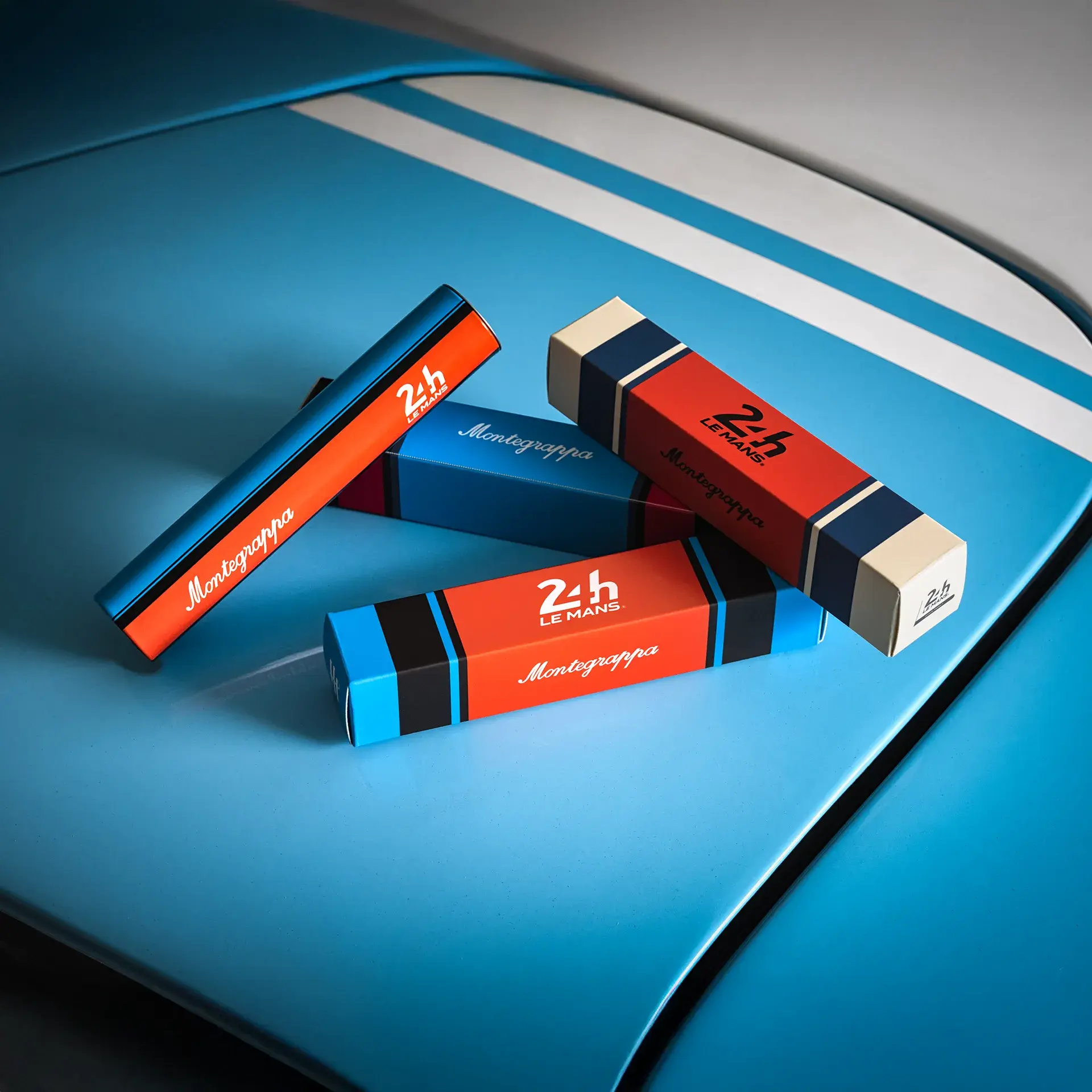Trois livrées de courses emblématiques symbolisent un siècle d’excellence automobile. De l’emblème des 24 Heures du Mans au drapeau à damier, chaque détail est une référence à l’un des mouvements emblématiques de la course.