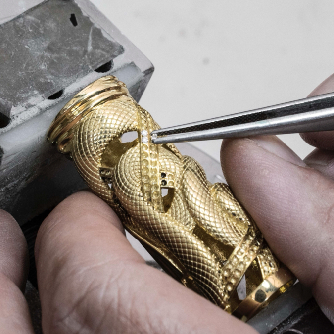 La fusione a cera persa, tecnica usata nella produzione di gioielli da oltre 4.000 anni, richiede un’elevata maestria nella scultura e nella realizzazione degli stampi. Ogni elemento, anche il più elaborato, viene fuso singolarmente e rifinito a mano.