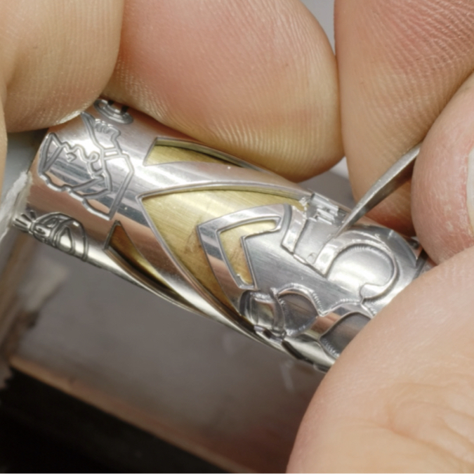 Generalmente applicata all’argento e all’oro, l’incisione a basso rilievo — o bas-relief — permette di ottenere sorprendenti variazioni di profondità e intensità, come sul modello Hemingway: The Adventurer (2020).