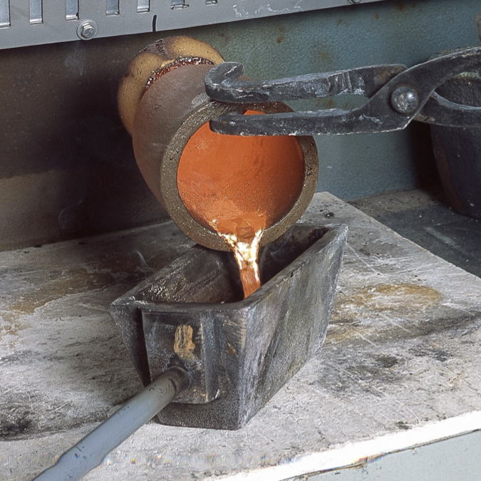 La cera scolpita viene racchiusa in stampi di gesso o silice, che vengono pressurizzati, induriti e cotti in forno per sciogliere la cera (da cui il termine “a cera persa”). I singoli elementi vengono poi fusi utilizzando gli stampi così ottenuti.