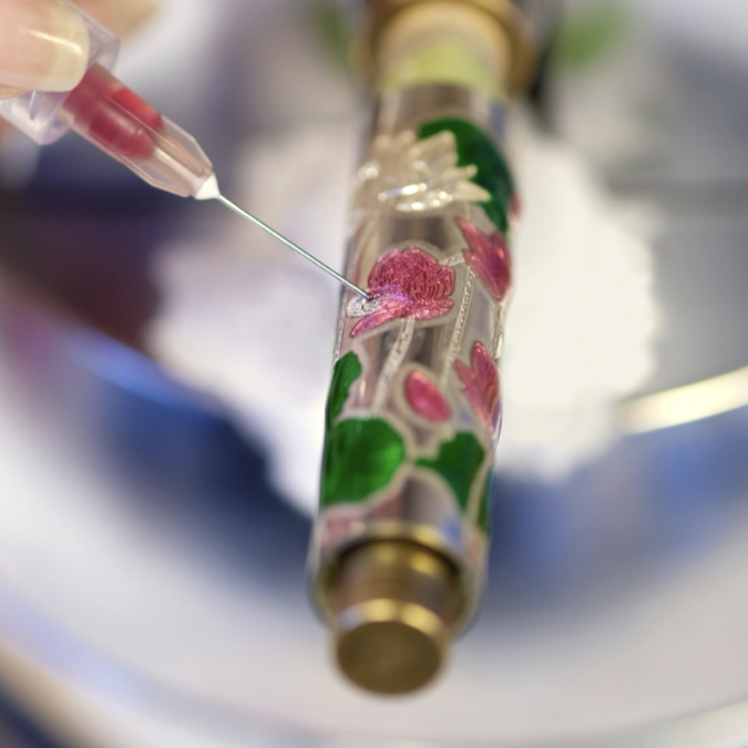 La tecnica del cloisonné dona colori ricchi e vibranti ai metalli preziosi. La smaltatura a mano richiede massima concentrazione e grande perizia nella lavorazione del metallo. Anche il più piccolo errore o imperfezione può compromettere la qualità del risultato.
