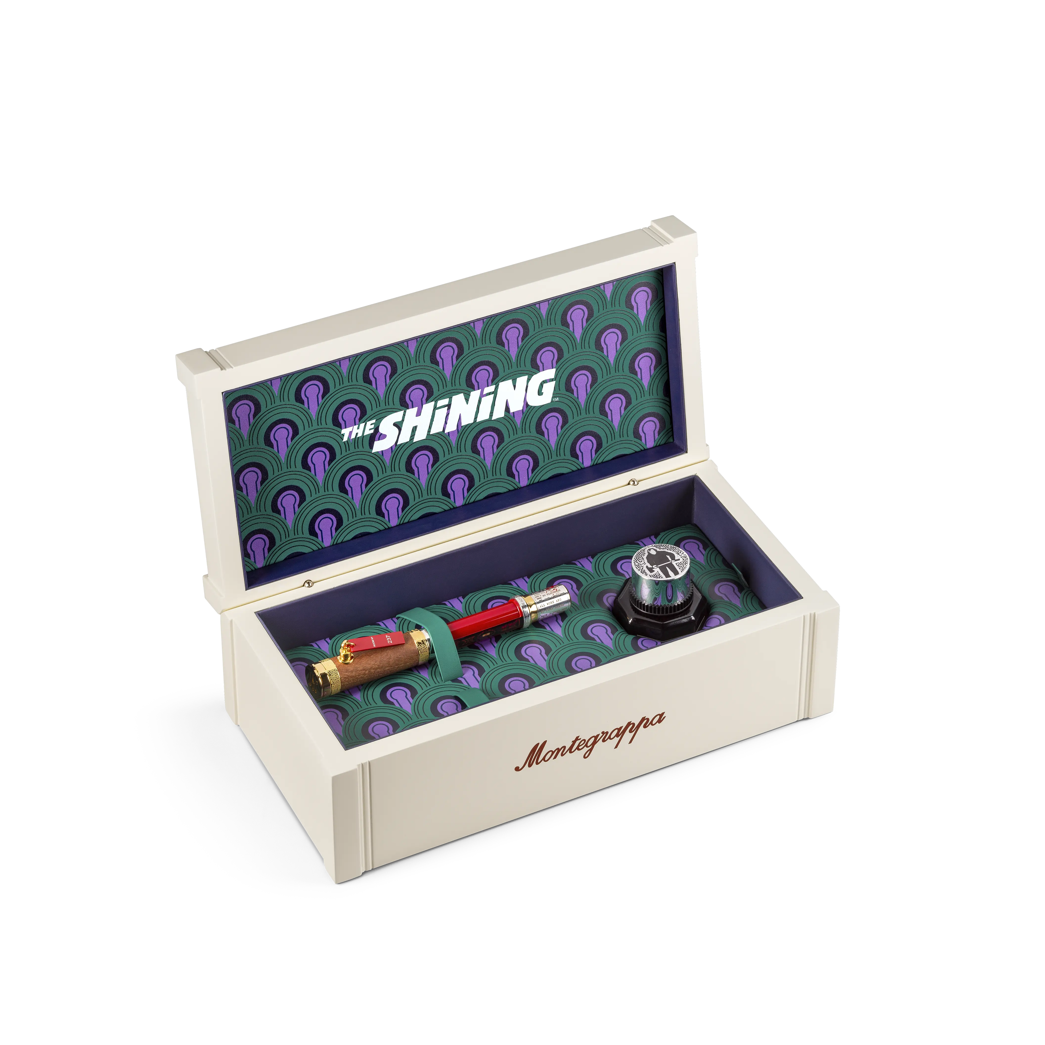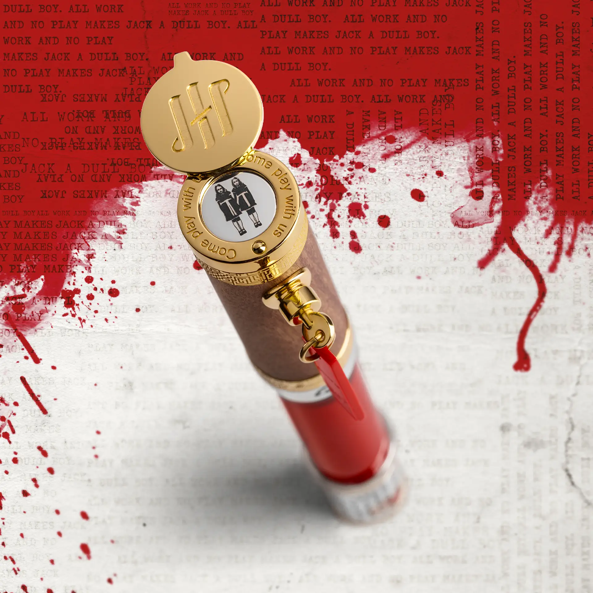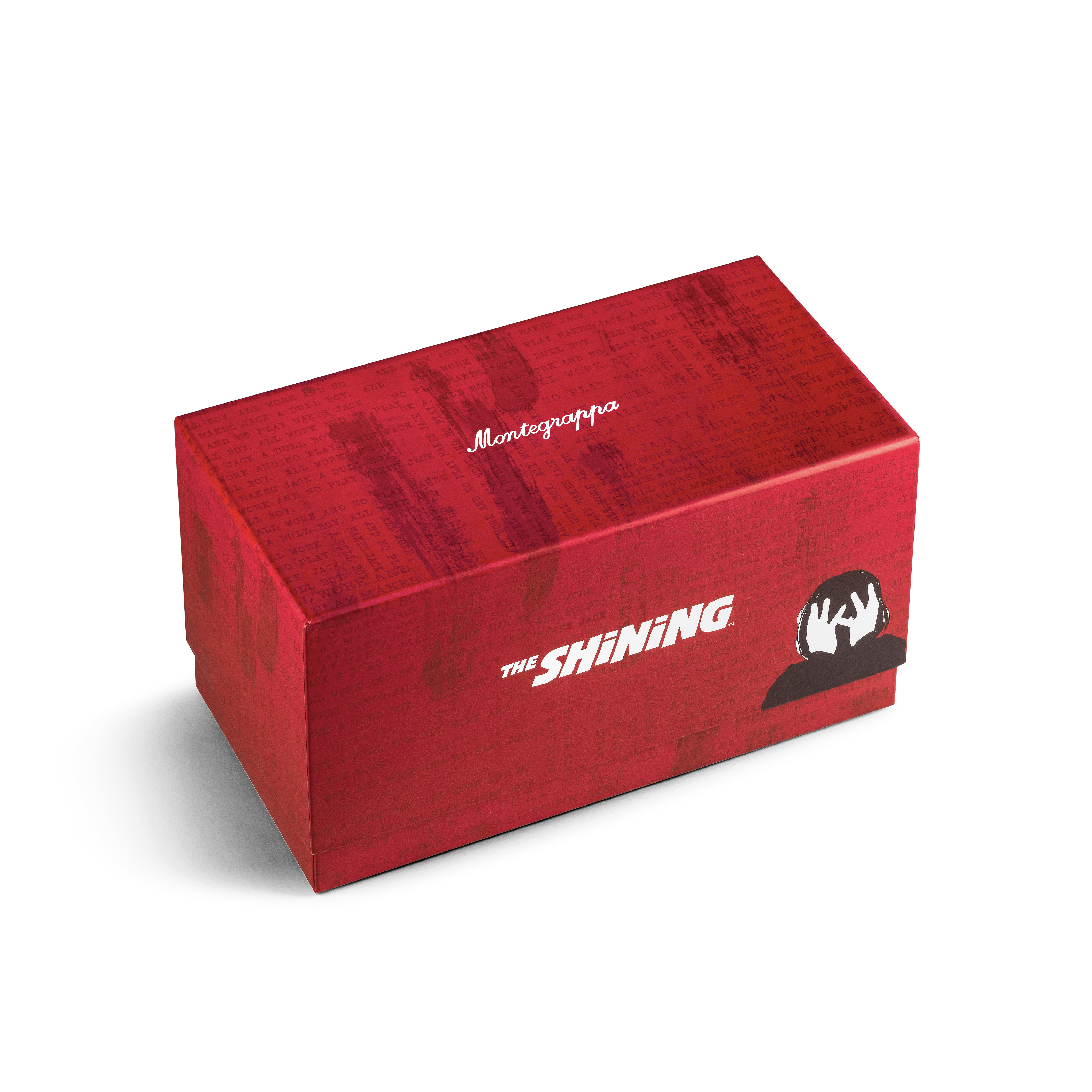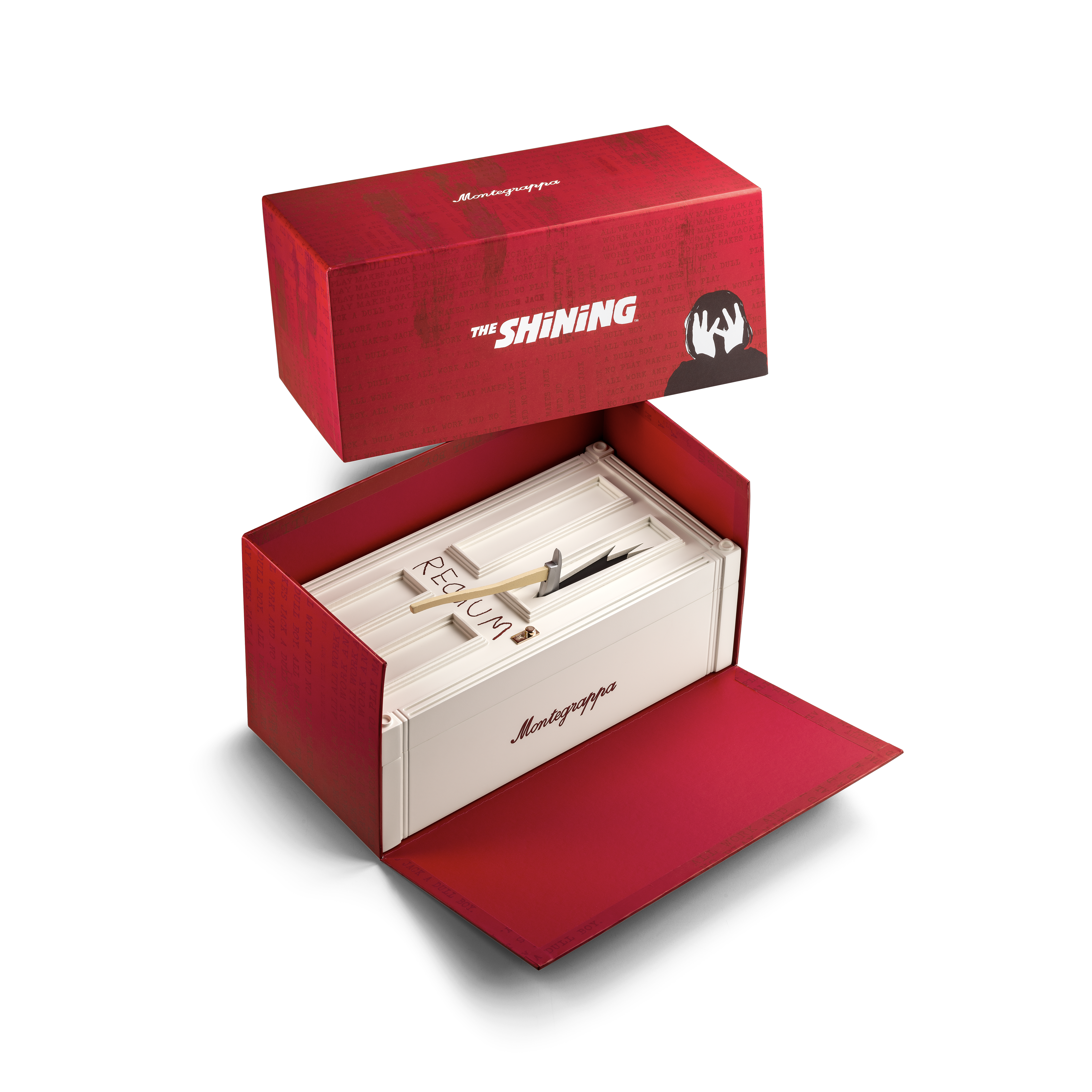 Ogni penna alloggia in un cofanetto che restituisce in miniatura la porta dell’appartamento della famiglia Torrance, segnata dalla scritta REDRUM, MURDER allo specchio.