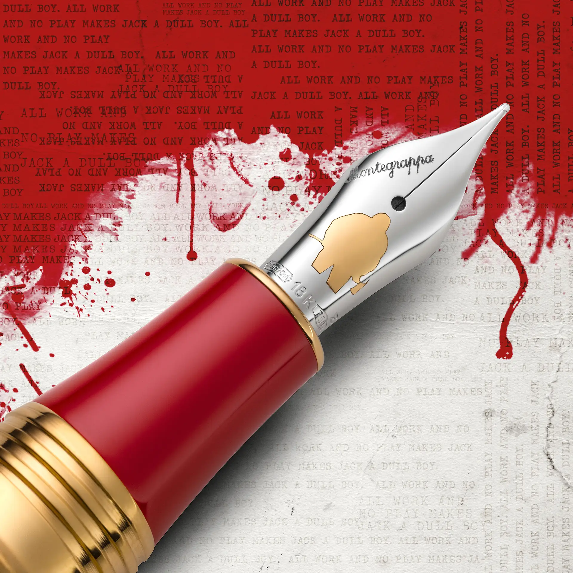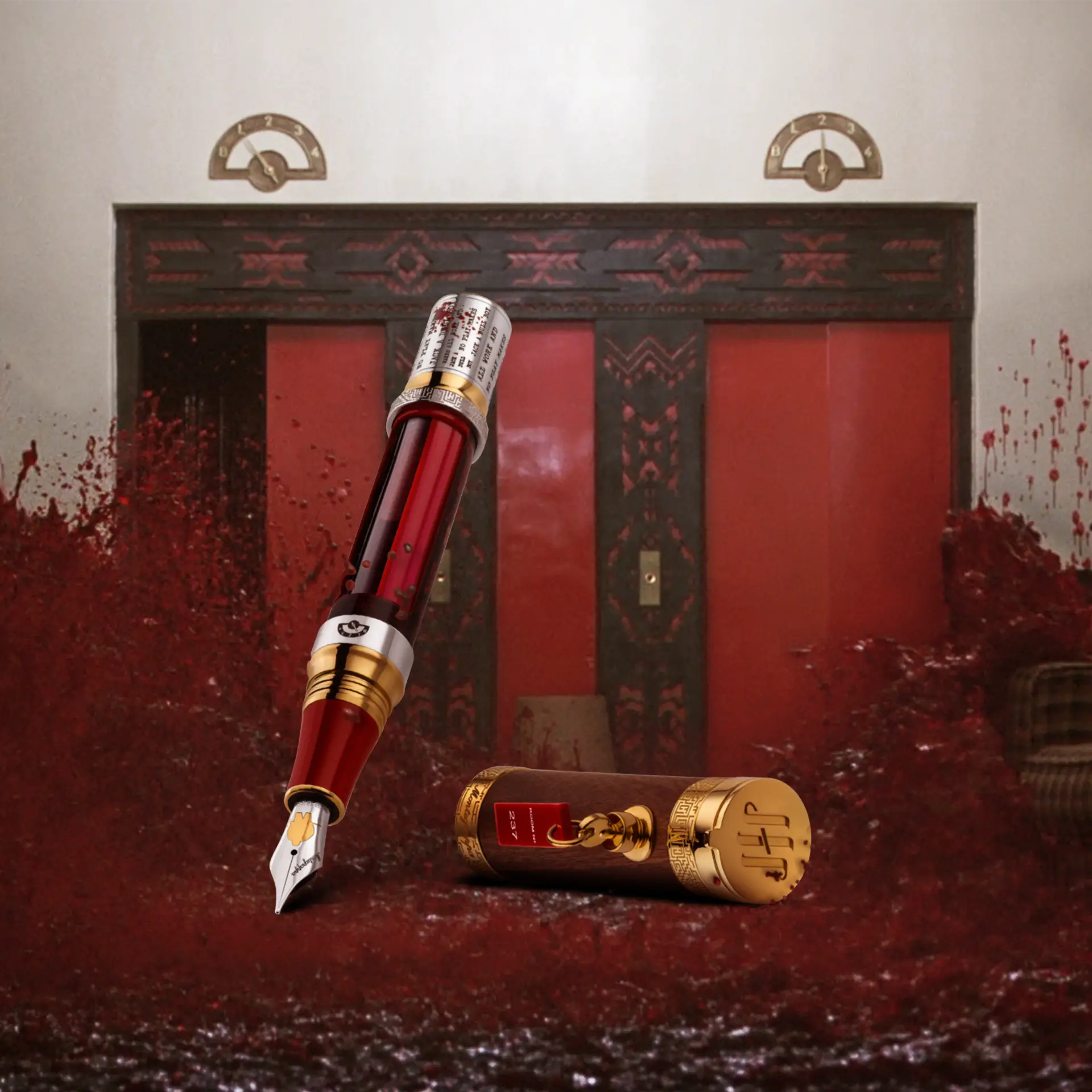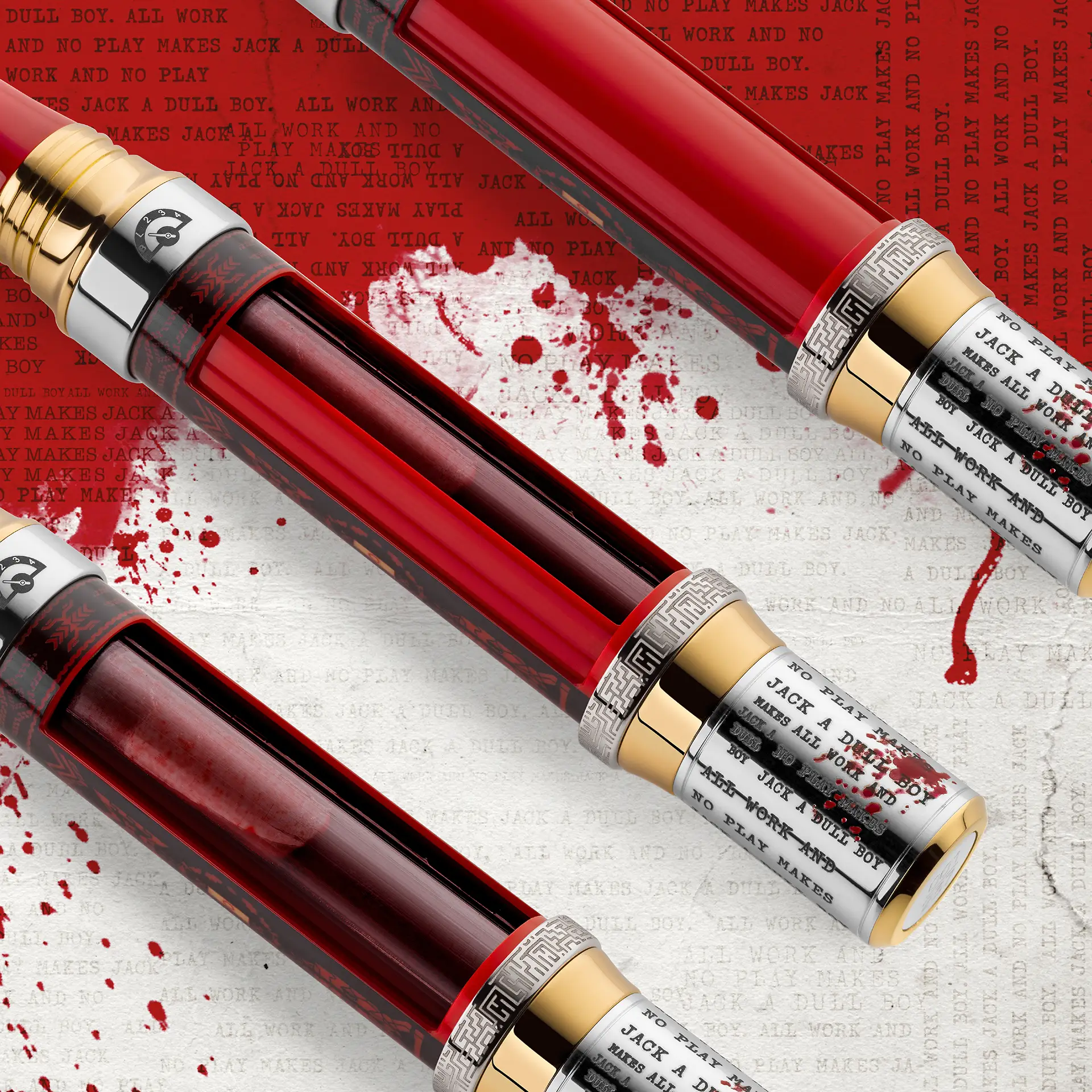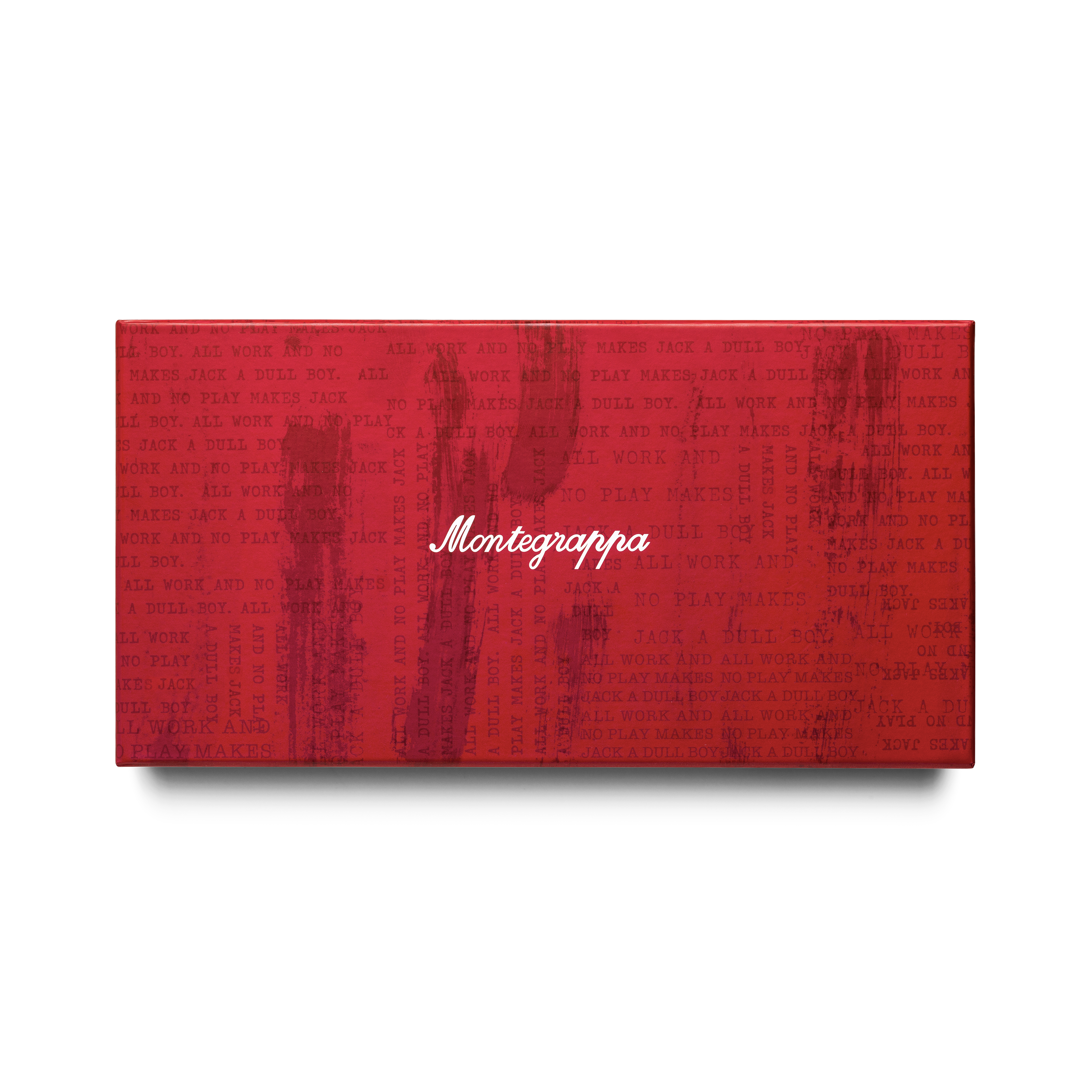 Ogni penna alloggia in un cofanetto che restituisce in miniatura la porta dell’appartamento della famiglia Torrance, segnata dalla scritta REDRUM, MURDER allo specchio.