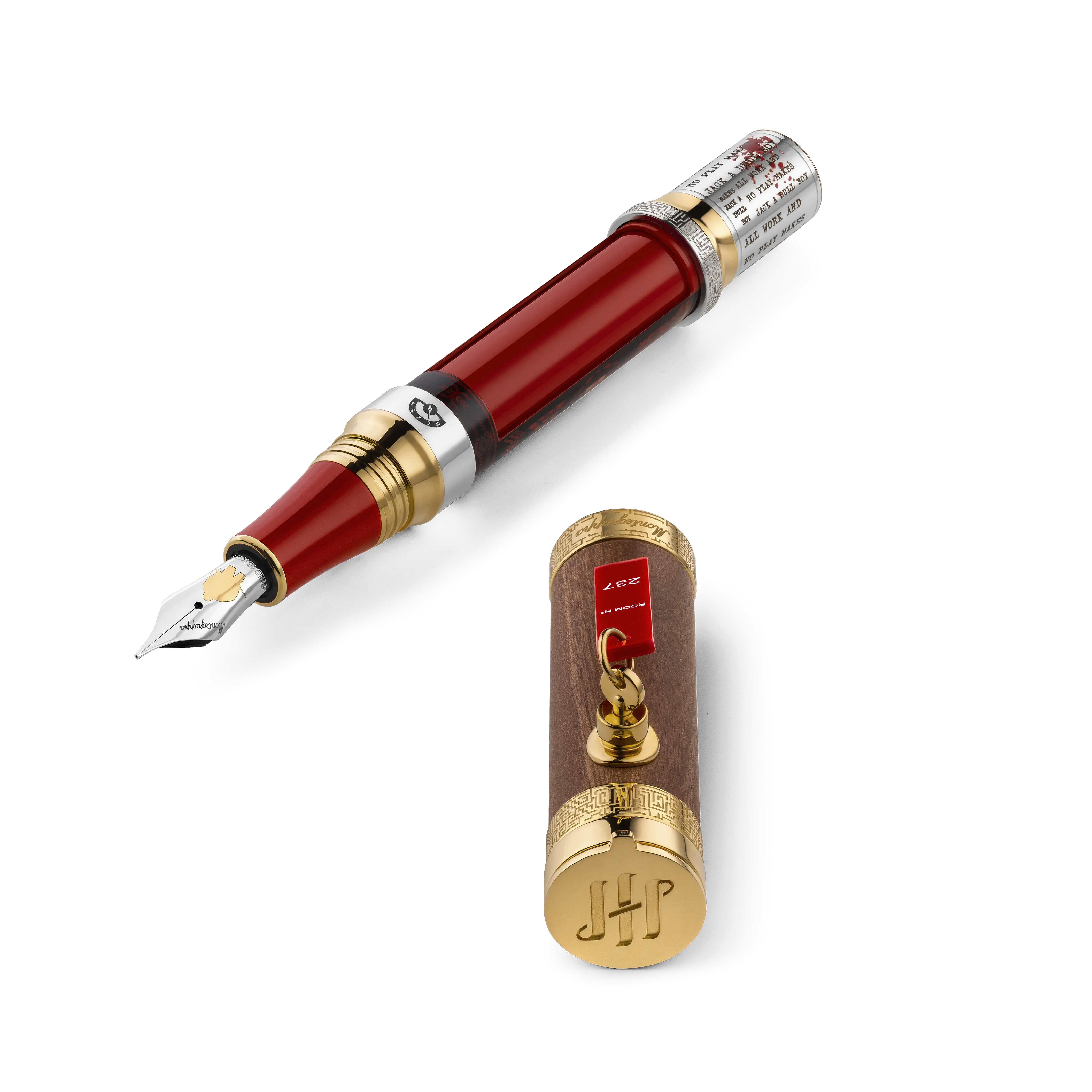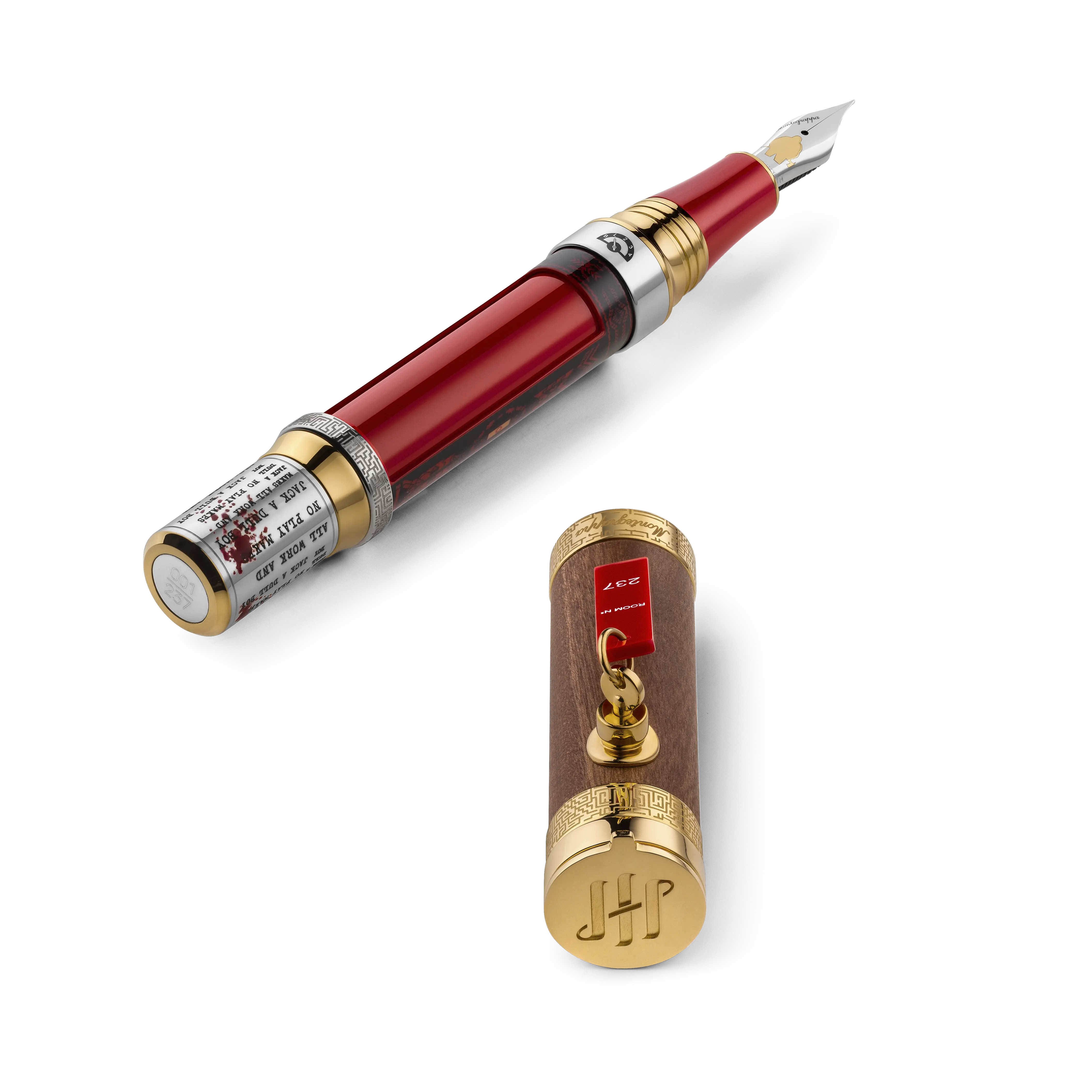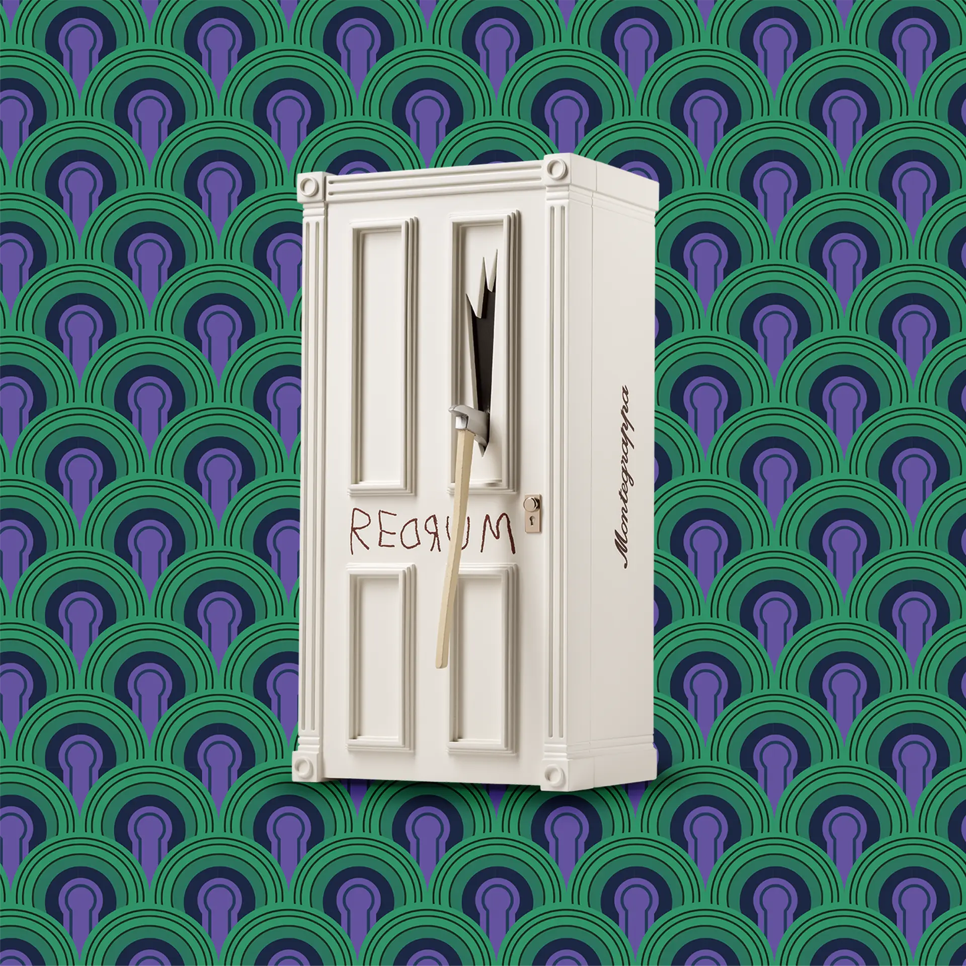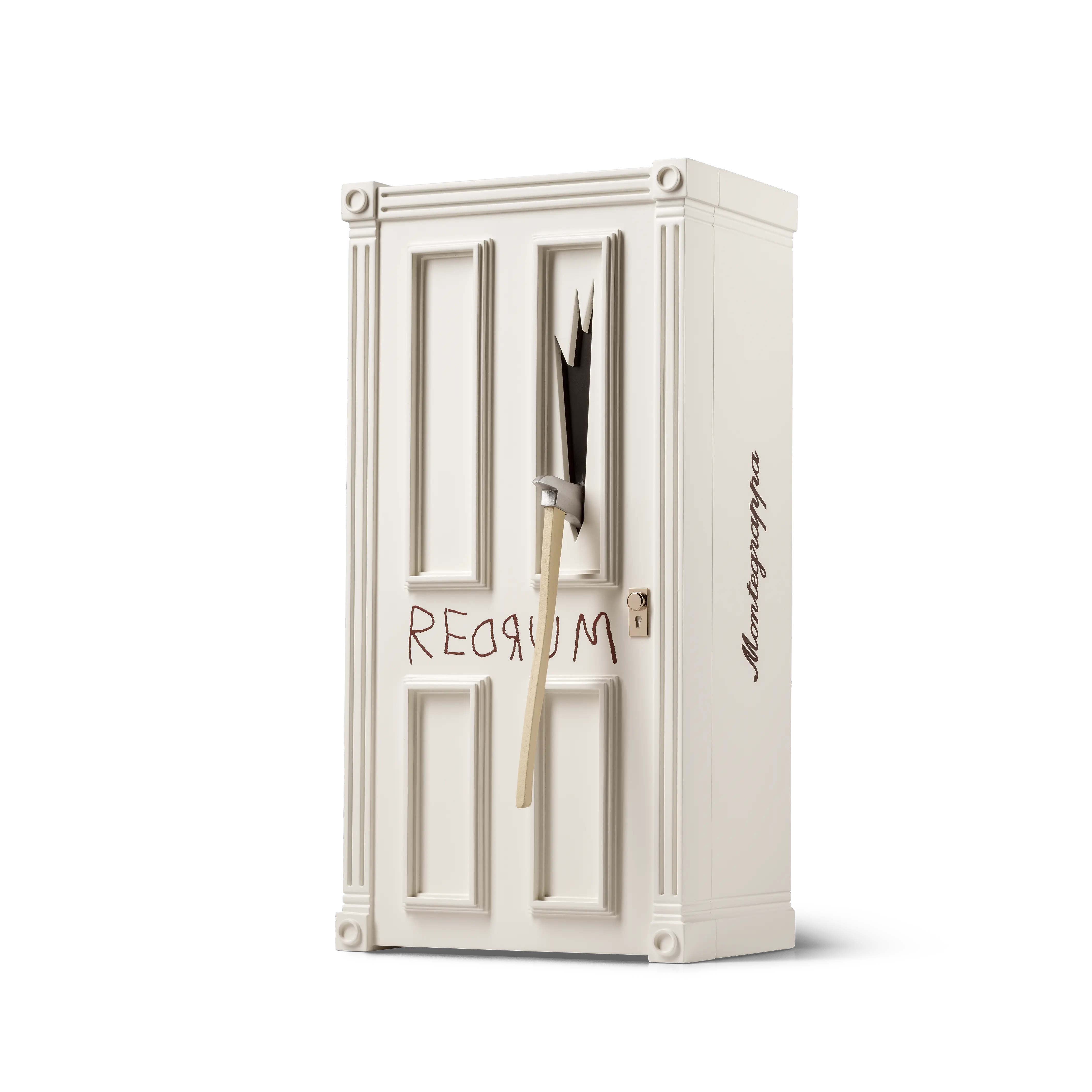 Ogni penna alloggia in un cofanetto che restituisce in miniatura la porta dell’appartamento della famiglia Torrance, segnata dalla scritta REDRUM, MURDER allo specchio.