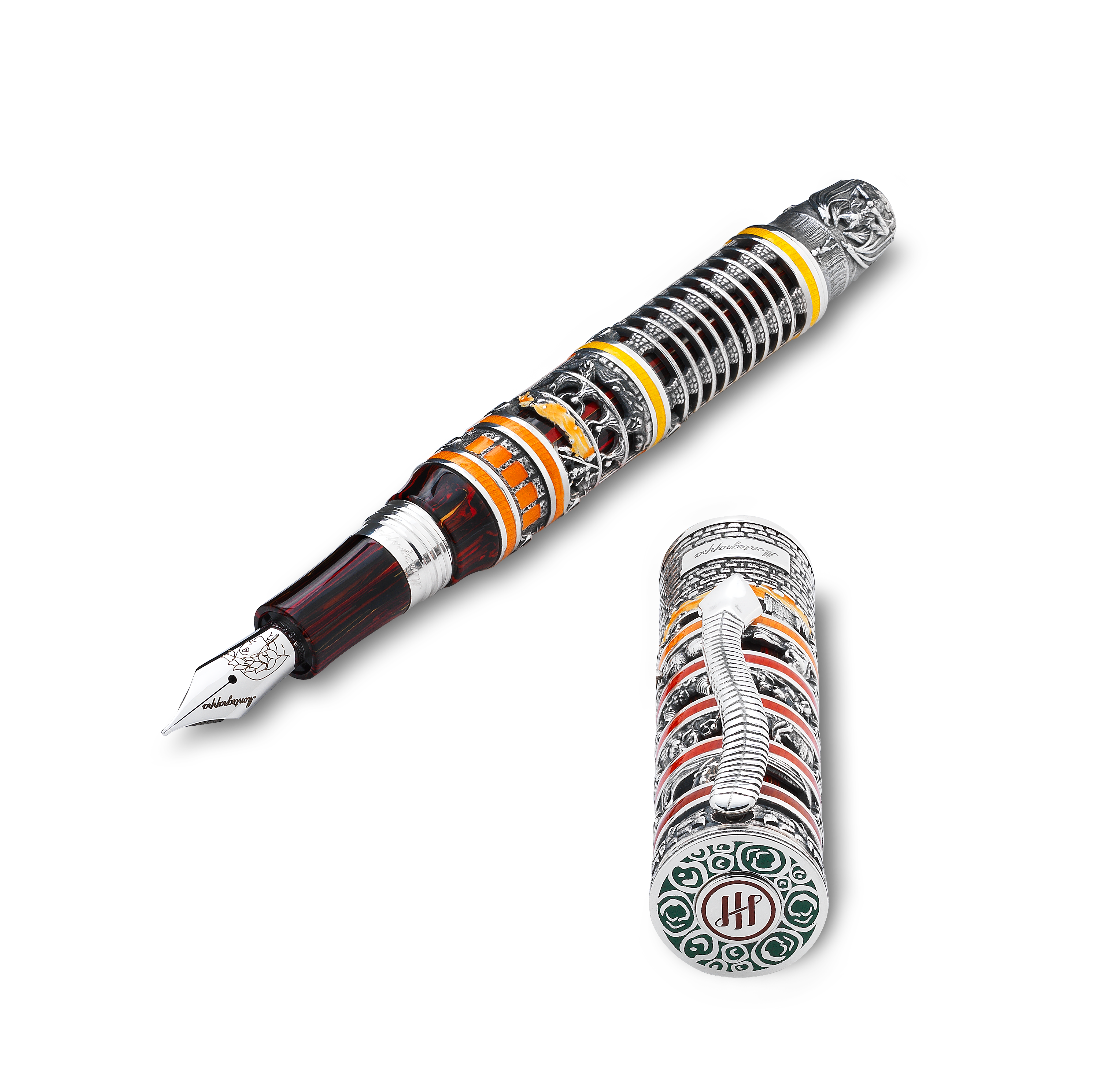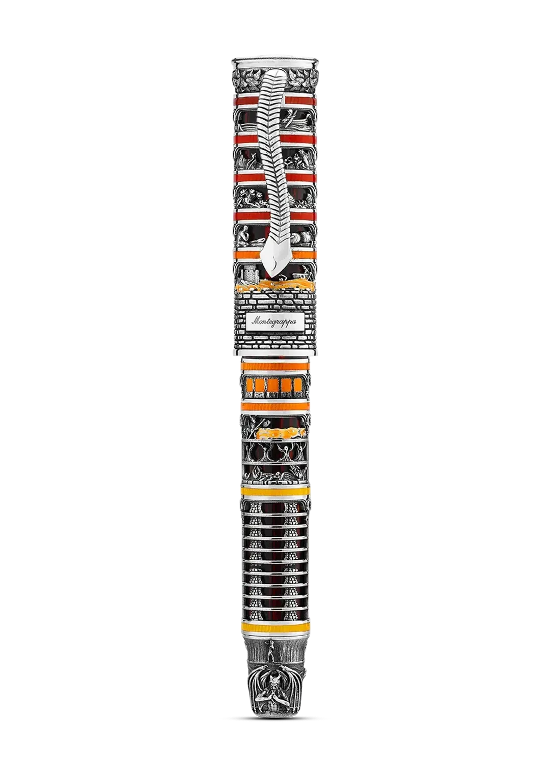 Il nostro primo omaggio a Dante è stato lavorato artigianalmente con religiosa accuratezza; i numeri di questa edizione limitata, 333 versioni in argento e 9 in oro 18 carati, onorano lo stile delle terzine in rima del poeta. Il design, rifinito con resina artigianale Montegrappite di colore “magma” e una corona smaltata a mano, interpreta la storia dantesca del viaggio di un pellegrino verso Dio.