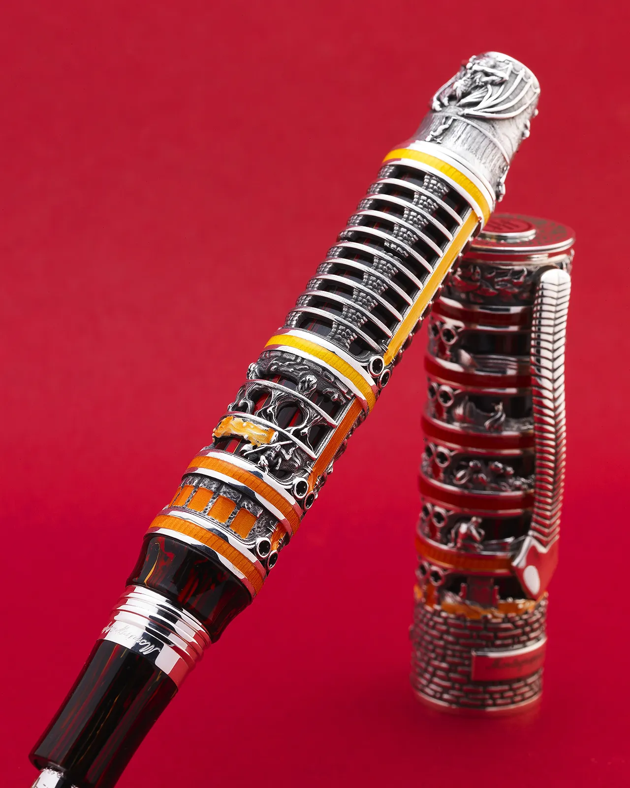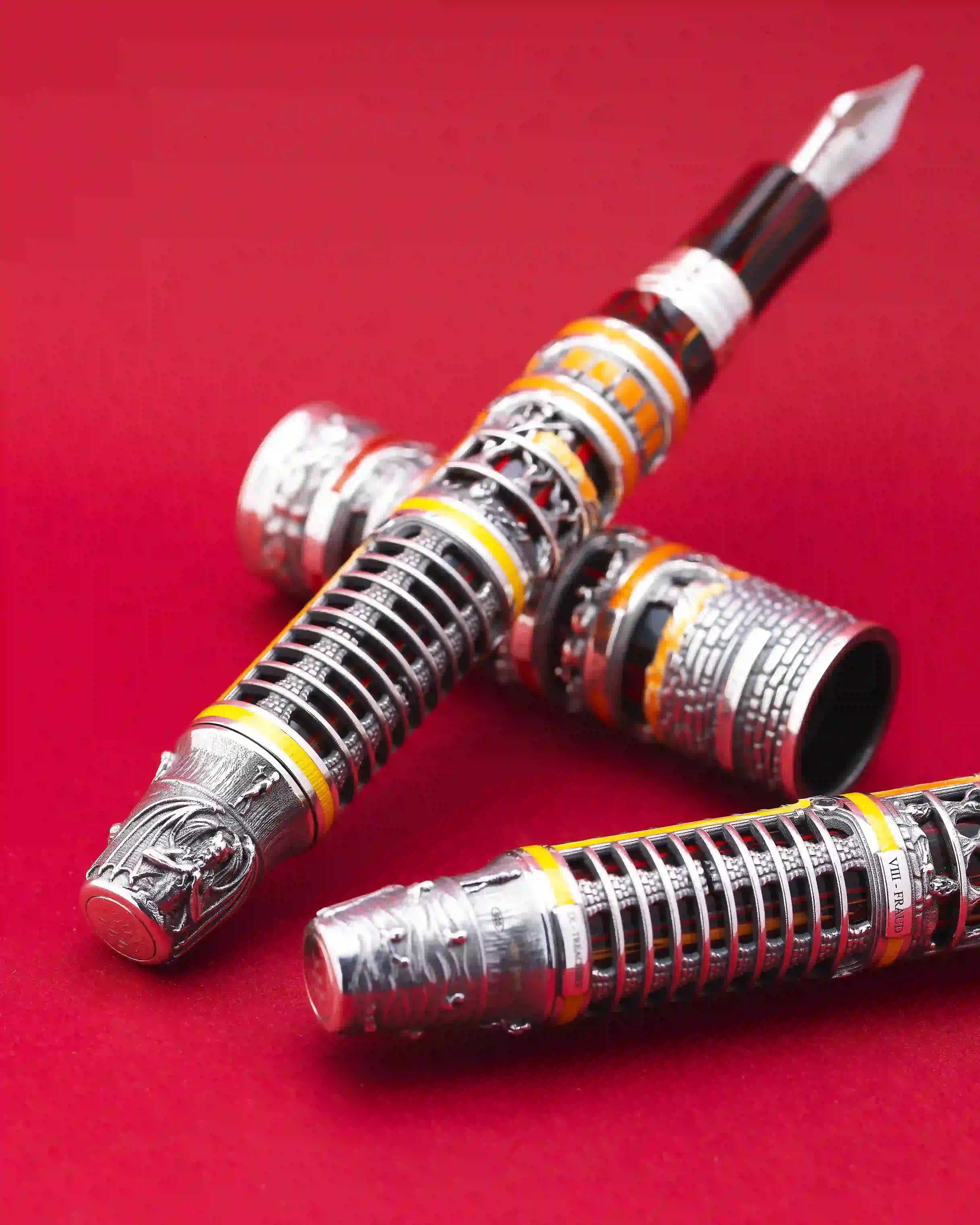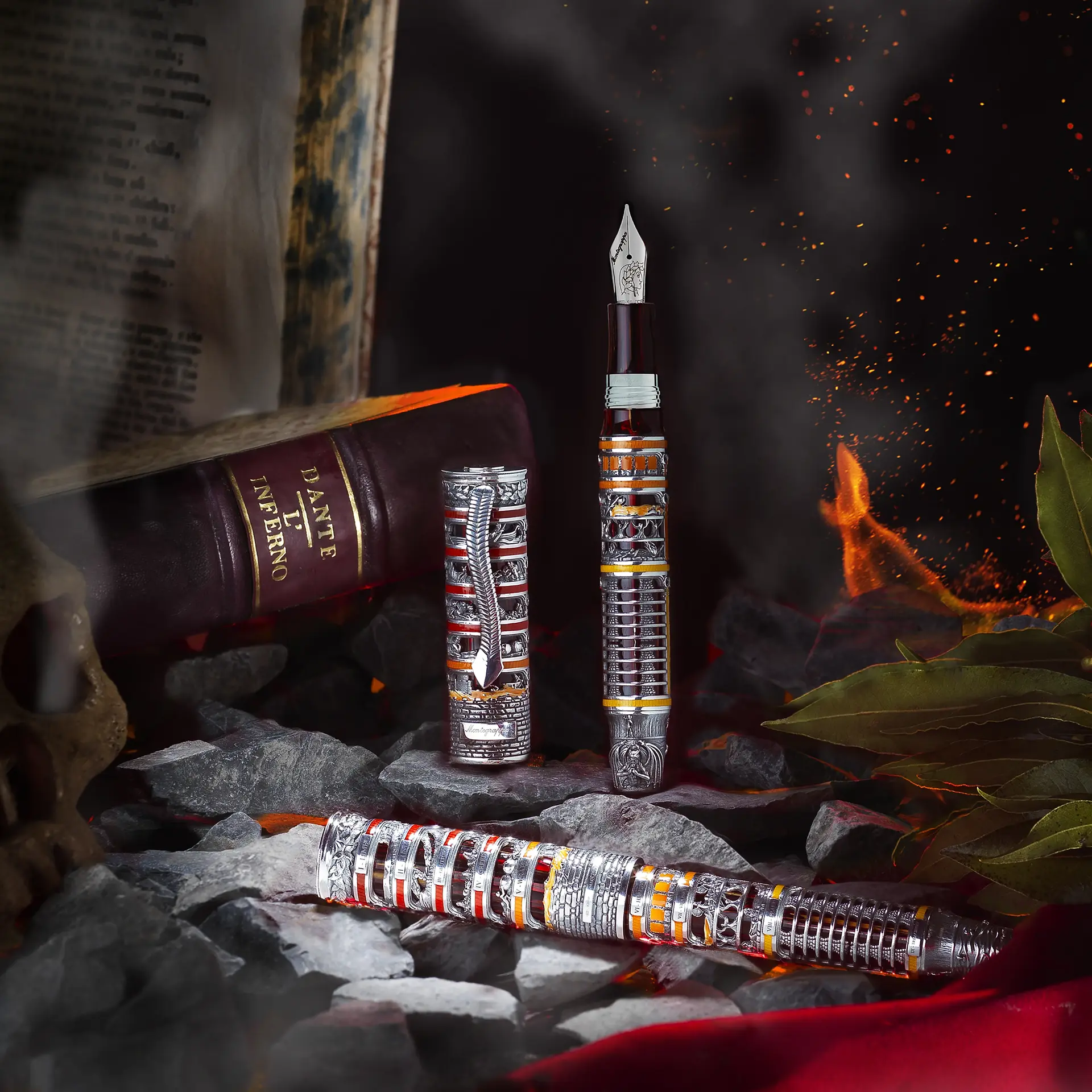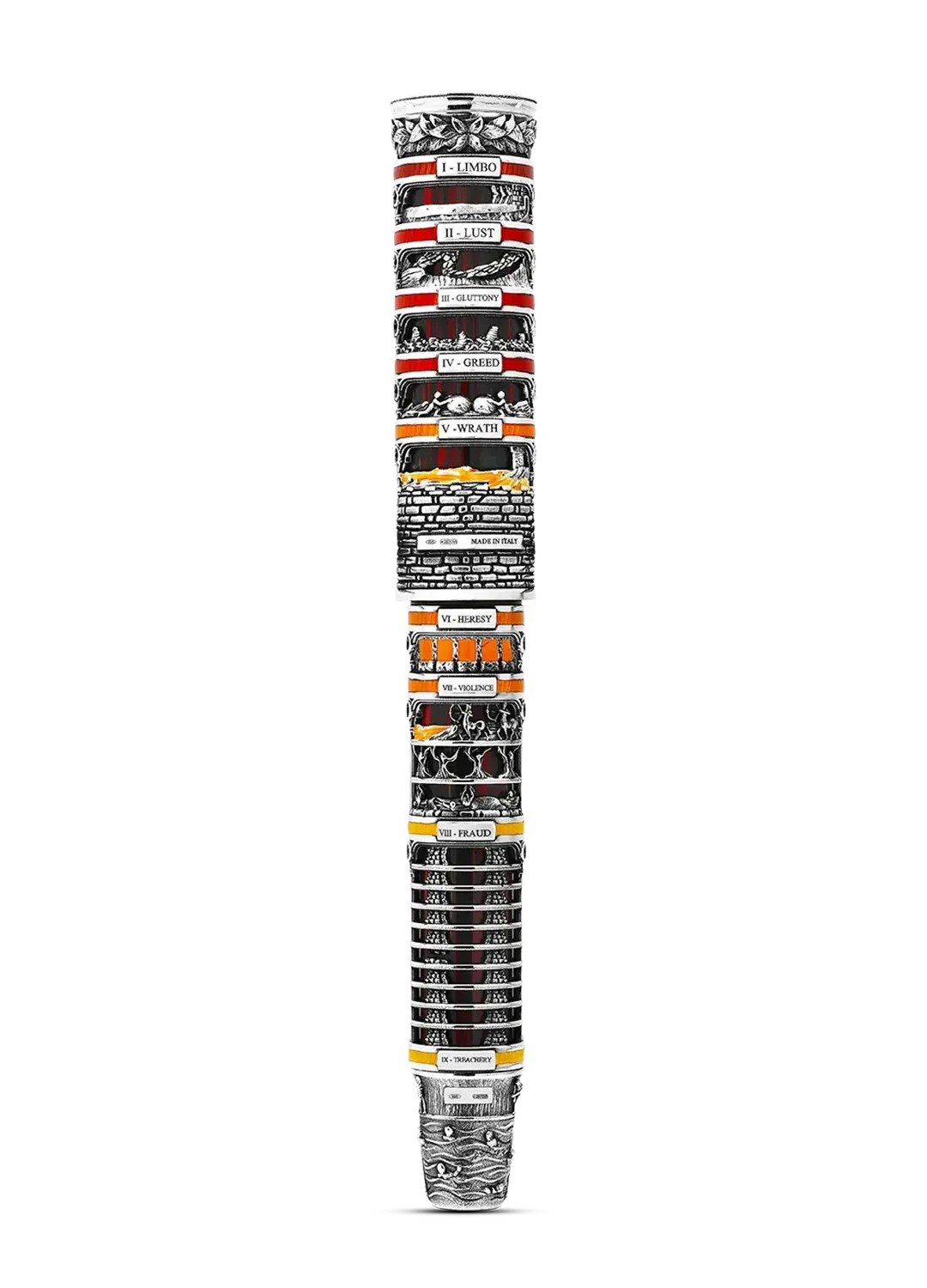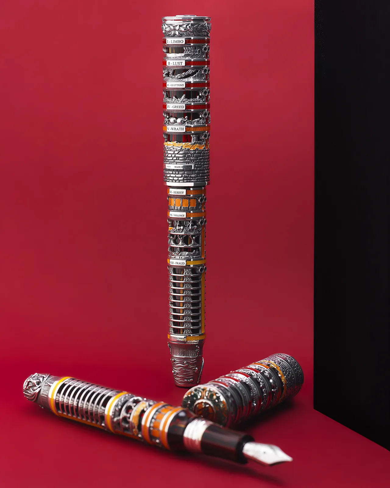 Presentata in una replica vintage del libro più famoso al mondo, ciascuna penna giace protetta dalla trascrizione delle parole inscritte sulla porta dell’inferno:
