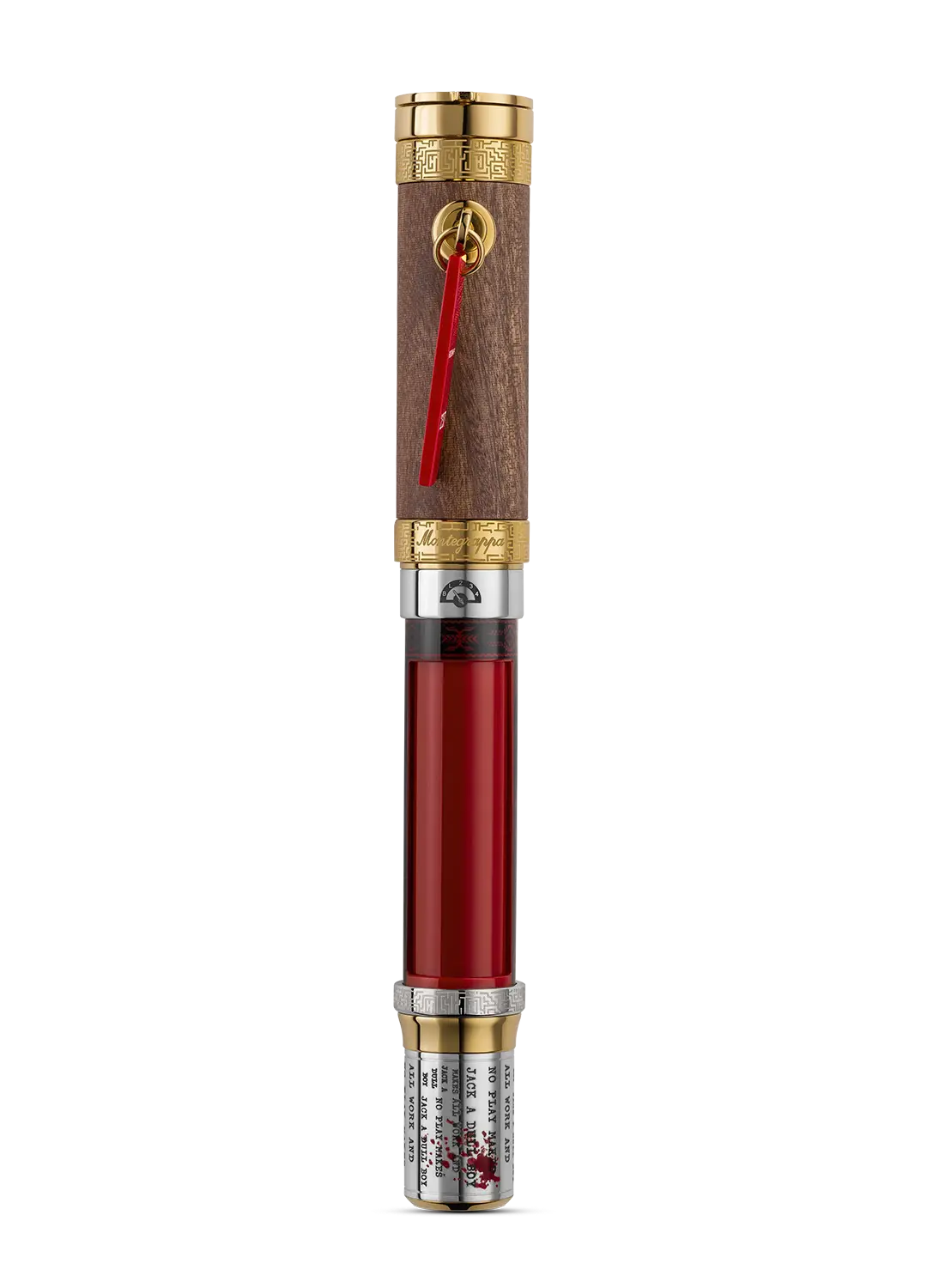 Ogni penna alloggia in un cofanetto che restituisce in miniatura la porta dell’appartamento della famiglia Torrance, segnata dalla scritta REDRUM, MURDER allo specchio.