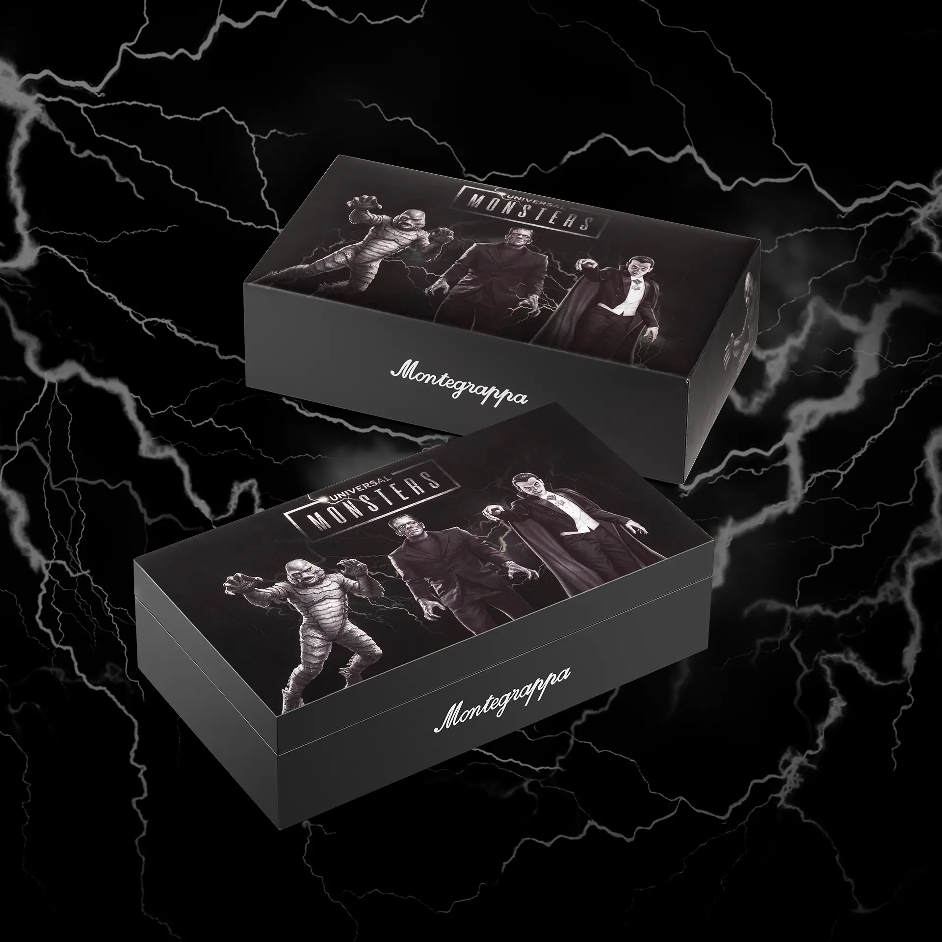 Oscuro come il grande schermo, il cofanetto della collezione Universal Monsters richiama i contrasti in bianco e nero dei classici Universal. Sotto il logo ufficiale, le tre icone del cinema horror si risvegliano tra bagliori elettrici, pronte a prendere vita sulla pagina.