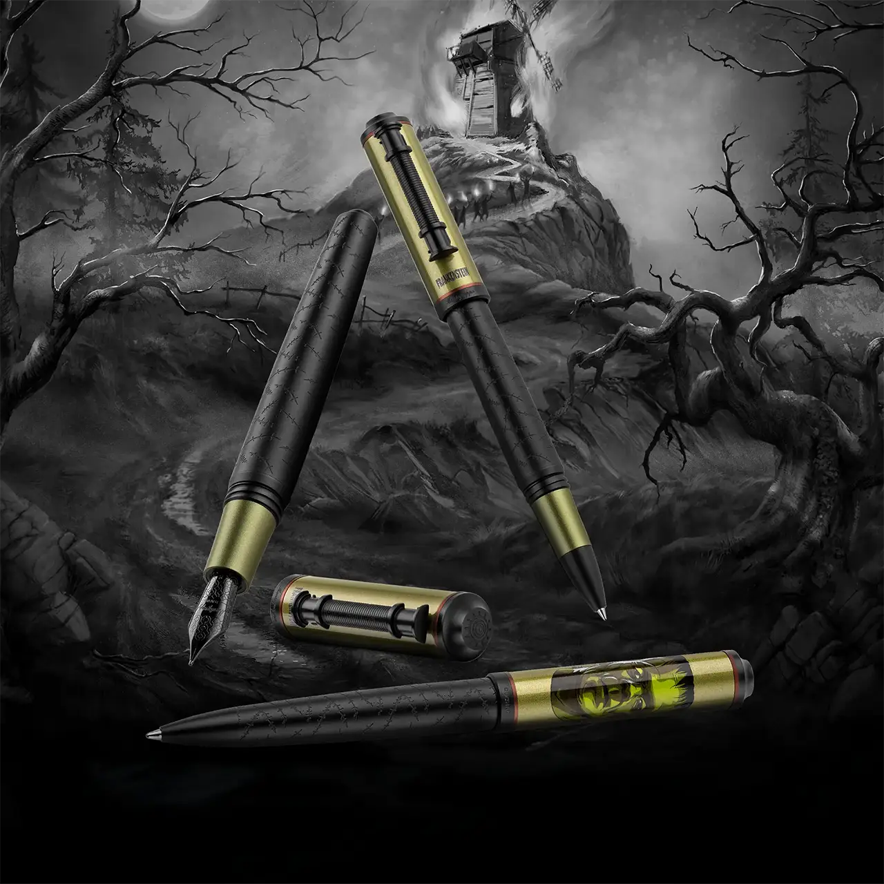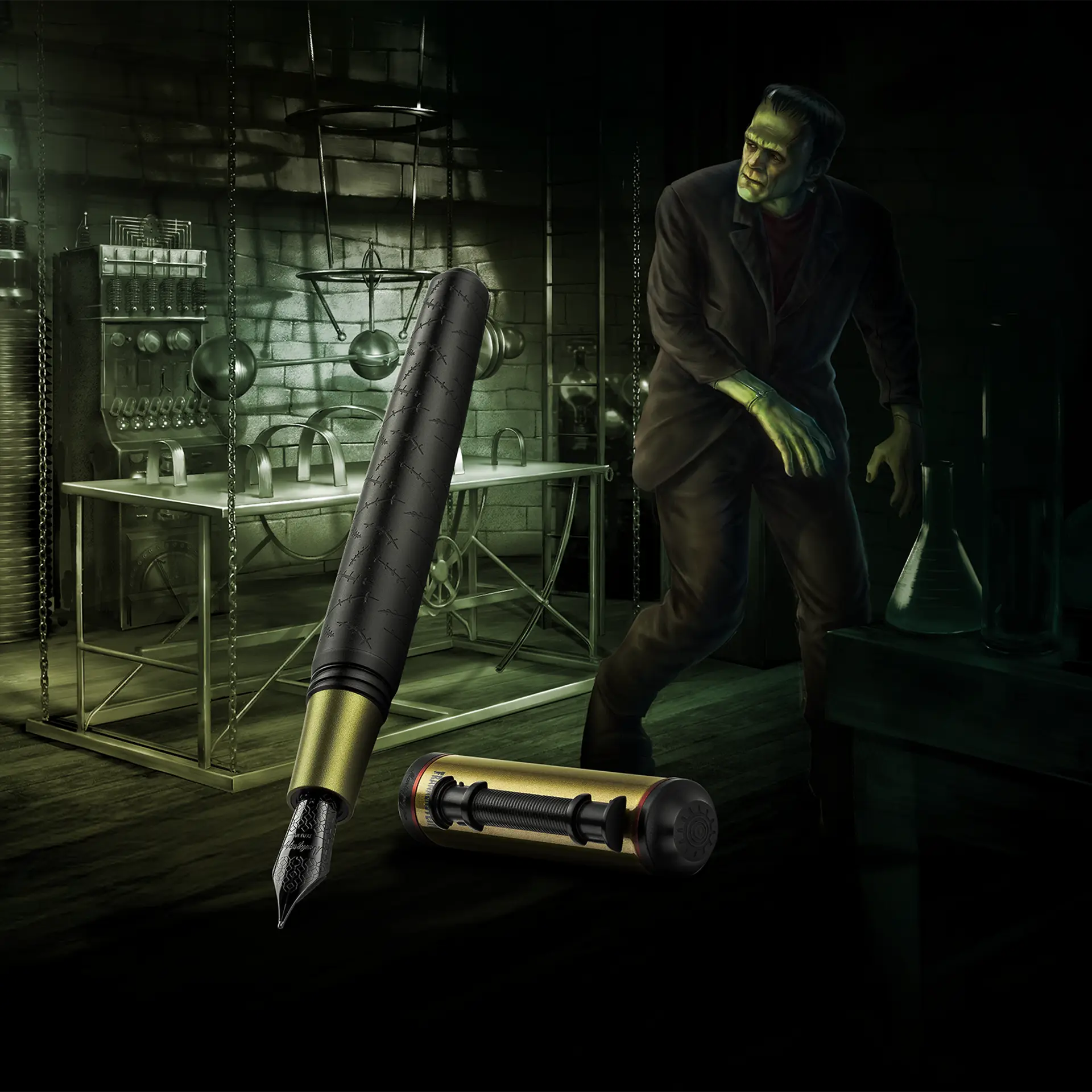 Emblema eterno di paura e umanità, Frankenstein torna a vivere in una creazione che fonde arte e cinema: il corpo attraversato da segni di suture, il cappuccio verde oliva e la clip a elettrodo raccontano la scintilla che trasformò la follia in leggenda.